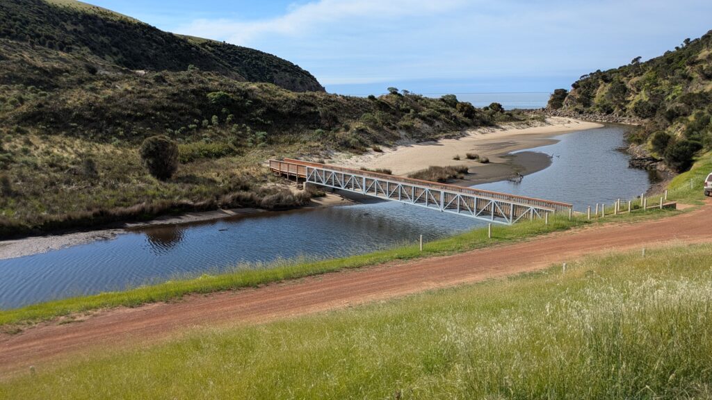 More traversing of the north coast, more beautiful farmland, more fat and happy sheep, until we dropped down into Western River Cove to camp for the night. And crazy coincidence, despite this obscure and remote location on the uninhabited north coast, another Trayon camper, the same brand as ours, pulled in. Chong and Deb were delightful company that evening around the fire. We loved having their company.