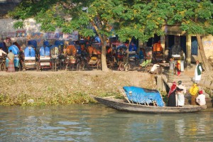 With great reluctance we left the Rocket at a village called Halur Hat, one of many stops on the Rocket’s itinerary but the best place to get connecting transport to our eventual destination of Mongla. Unfortunately the day was marked by some political protests which included strikes by all forms of public transport so there were no buses or other viable options for the next leg of our journey. In the end we teamed up with an American grandfather and a British writer who were both travelling independently on the Rocket also, and the four of us crammed into a tiny auto-rickshaw for the 100 km slow journey to Mongla.
