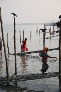 The sardine treatment in the auto-rickshaw was not the best and progress was very slow but the views of the Bengali countryside along the way more than made up for it. The roads were usually a single lane, some in quite poor condition, and they weaved amongst the beautiful rice fields and fish farms and through tiny villages. As we passed through people would stare in amazement at the sight of three large foreigners (plus Julie, not so large) and all their bags crammed into this auto-rickshaw.