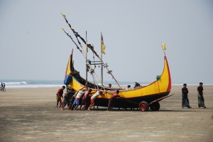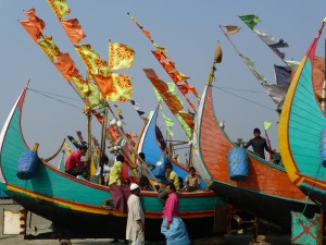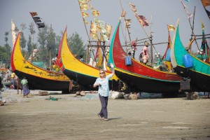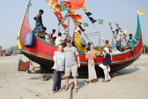 And as we stood there in awe, boat after boat arrived and hit the beach, quickly surrounded by helpers who maneuvered the curved bow of the boat up onto the axle of two huge rubber tires. Then they would all push and pull the large boat above the high water line and unload the catch from their three day expedition. We were told a typical catch would be worth about 10,000 Taka which was about $110 for three days of work and 10 fishermen.