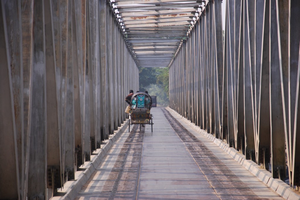 A narrow steel bridge crosses another waterway in south-eastern Bangladesh