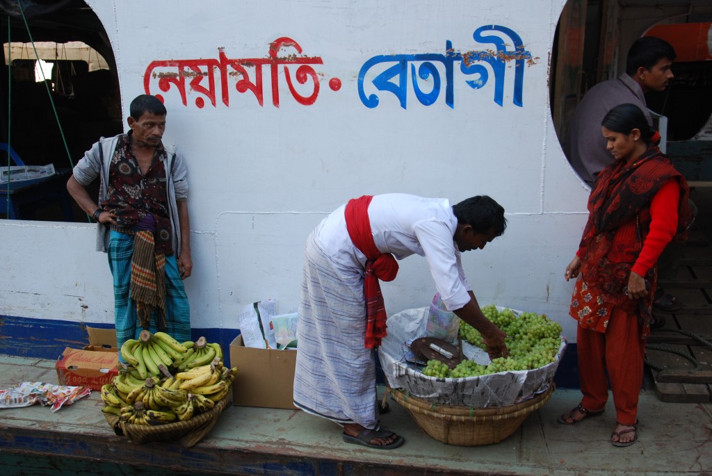 A quiet scene of commerce amongst the chaos on the boats at Sadargat in Dhaka