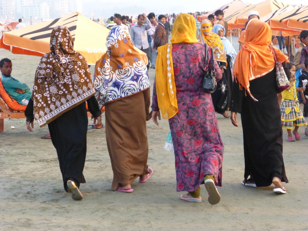 Colourfully dressed women walk along the beach in Cox's Bazar