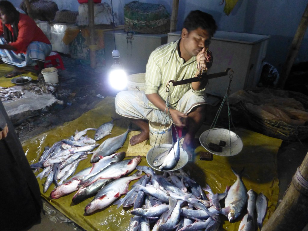 A fishmonger weighing up a sale in a night market near Cox's Bazar