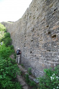 A little awe struck by the scene before us we slowly started to walk in an easterly direction, carefully negotiating the path along the top of the wall. This section had not been restored at all and in many places it had suffered considerable damage, making the trail narrow and tricky. But as the wall generally followed the highest ridge of mountains it meant two key features – magnificent views in all directions at all times and some very steep sections as it climbed up and over mountain points. On numerous occasions we were left to almost crawl hand over feet up huge steps, testing the loose stones, stopping for photos and gazing off into the distance.