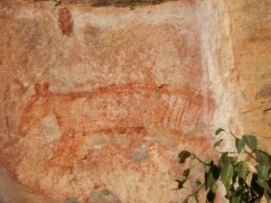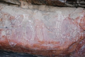We first visited Nourlangie, probably the largest and most accessible of the sites in Kakadu. The drawings are at the base of an outcrop of red rocks that protected the people from the soggy wet season. The drawings are spectacular in their vivid colours, clarity and story telling of ancient mythological figures, animals and people. We love the whole rock art scene and this was a great site to walk amongst the huge rocks, admire the drawings and try to imagine what it must have been like to live there 6,000 years ago.