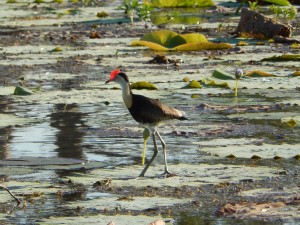 We headed south and west on the Arnhem Highway but turned off at the first chance to follow a 4WD dirt track to a series of billabongs where we hoped to find a place to camp for the night. This was a remote area in the forgotten heart of Kakadu and we were virtually the only people seen all afternoon. We followed the track for many kilometres, weaving our way through the melaleucas and pandanus, admiring the termite mounds and stopped at the various billabongs to scout for birds. It was a beautiful drive and after checking out various sites along the way we stumbled across a beautiful place to camp in a bend of the large Alligator Billabong, quiet and peaceful, beautiful calm water and…wait a minute…isn’t that croc on the other bank? Yes, it is, we have neighbours for the night after all.