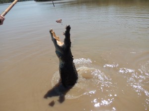 The next day we did what all tourists do when visiting the Mary River area, we went on another crocodile boat trip. But this was a trip with a difference because these are not ordinary crocs, these are jumping crocs. Yes, the idea here is that we all get on a crowded little boat run by two young girls, one drives the boat down the mighty Adelaide River and the other holds frozen chunks of buffalo dangling over the water from a string on a long pole. That sounds normal.