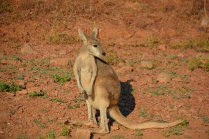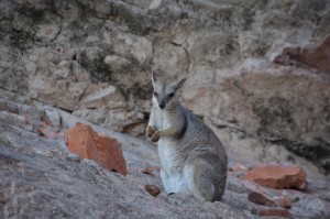 We booked a four hour sunset cruise to explore Lake Argyle and learn more about this amazing place. This was a small group on a small boat and we quickly saw the benefits again of booking with the smaller operator rather than the big boys. We crept around one corner of a rocky outcrop and our skipper threw food pellets to rare and shy small-eared rock wallabies that live in the crevasses of cliffs along the water’s edge. In another place we held pieces of bread over the water and small Archer fish came to the surface and shot water at it thinking it was shooting down an insect. A fish hunting out of the water! We saw many freshwater crocs, small groups of the common wallaroo called euros, and untold birds and other fish.