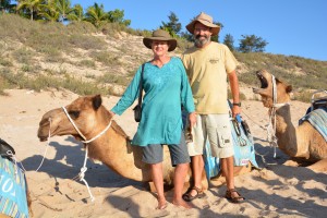 One of the ‘must do’ activities for all visitors in Broome is riding camels on the beach at sunset. And of course we did it! Camels are such an odd creature, taller than you expect, long eyelashes and an ugly grunt, ungainly to stand up from the sand after you climb on and with an uneven bumpy gait. It’s a very touristy thing to do but we loved the ride along the beach in a traditional camel train where one camel is tied to another and the beautiful sun set on schedule.