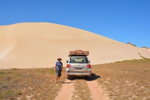 That night the wind picked up and our roof top tent was perched higher than any windbreak we could find. The wind hit us hard and rocked the car and tent all night long. It was a long noisy night in our cosy tent and by morning all our footprints and tyre prints in the soft sand were completely gone, as if we had no history at all.