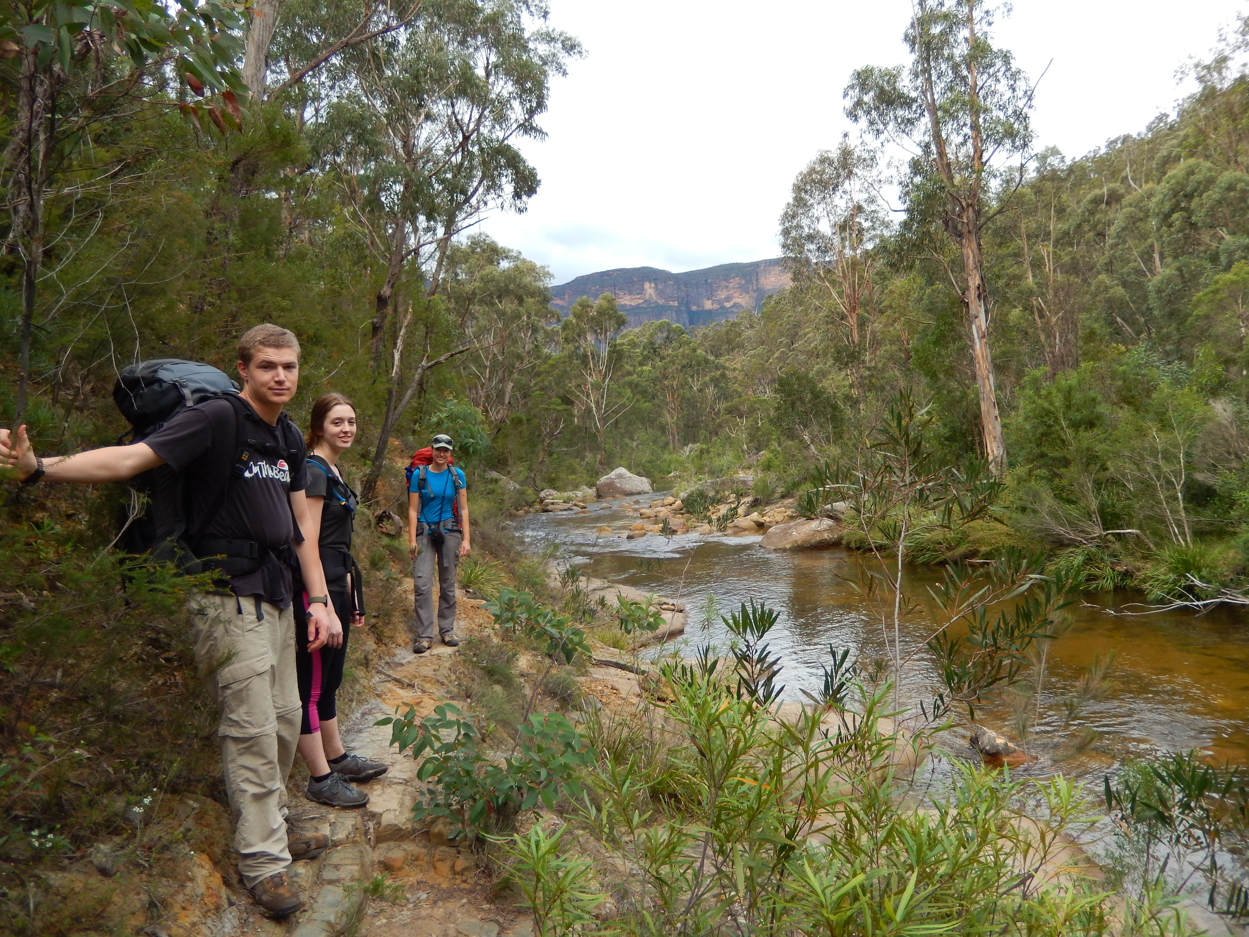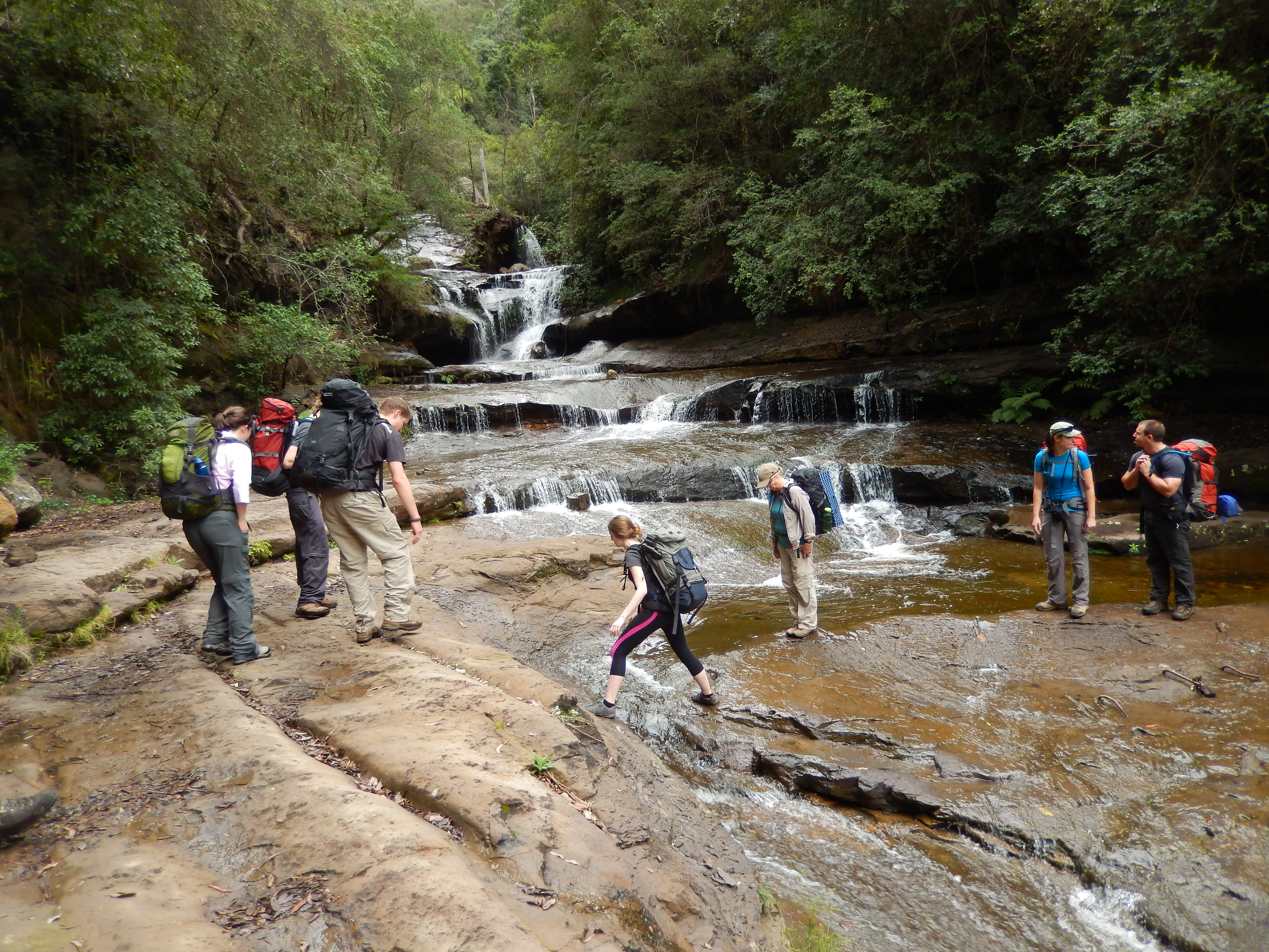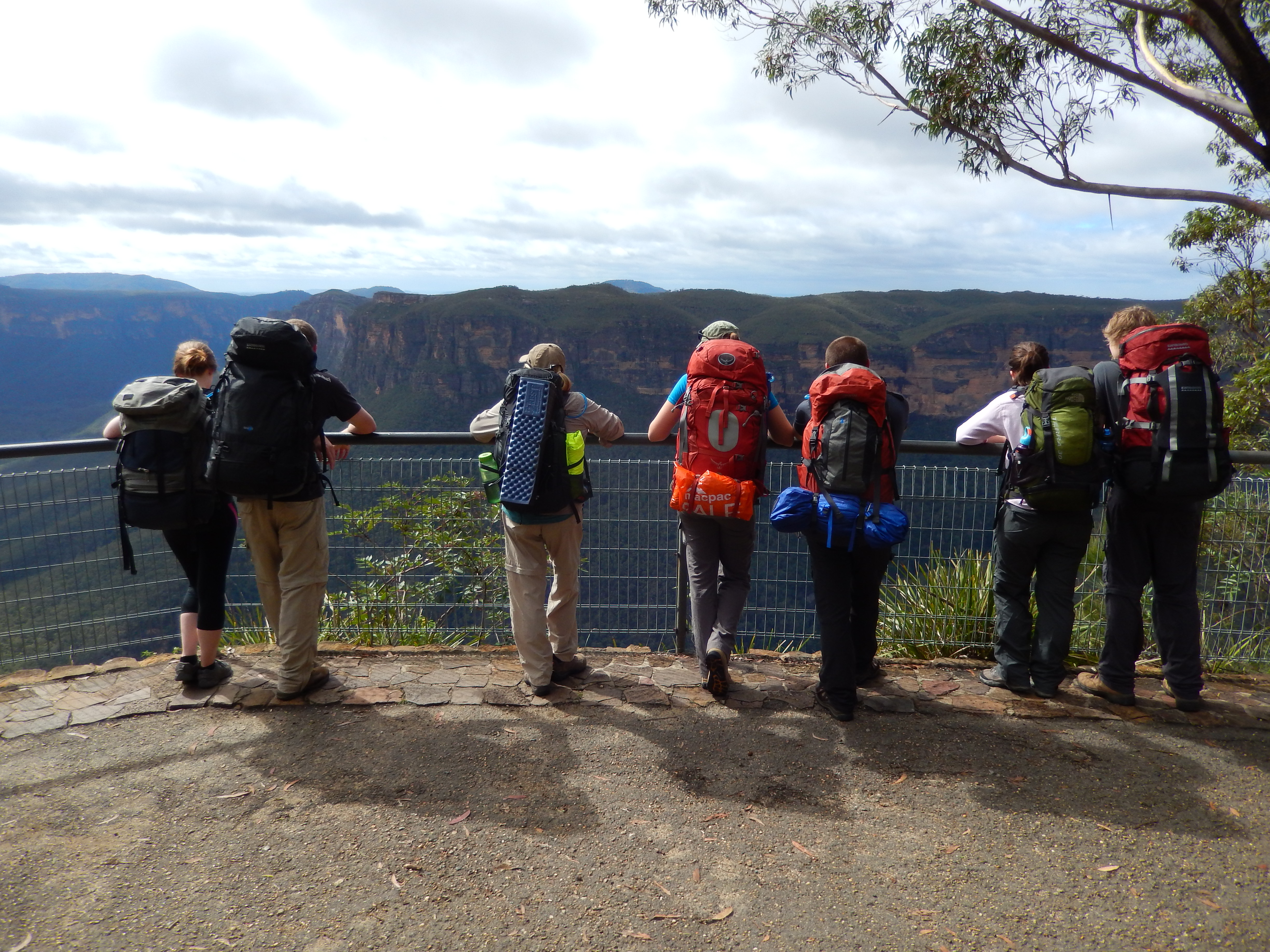 With full packs and strong backs we followed the trail along the cliff top to Barrow Lookout which gave us unique views of Bridal Veil Falls and Horseshoe Falls. Recent rains in the area meant these falls were unusually full and they provided a spectacular foreground to the vast spaces of the valley below us.