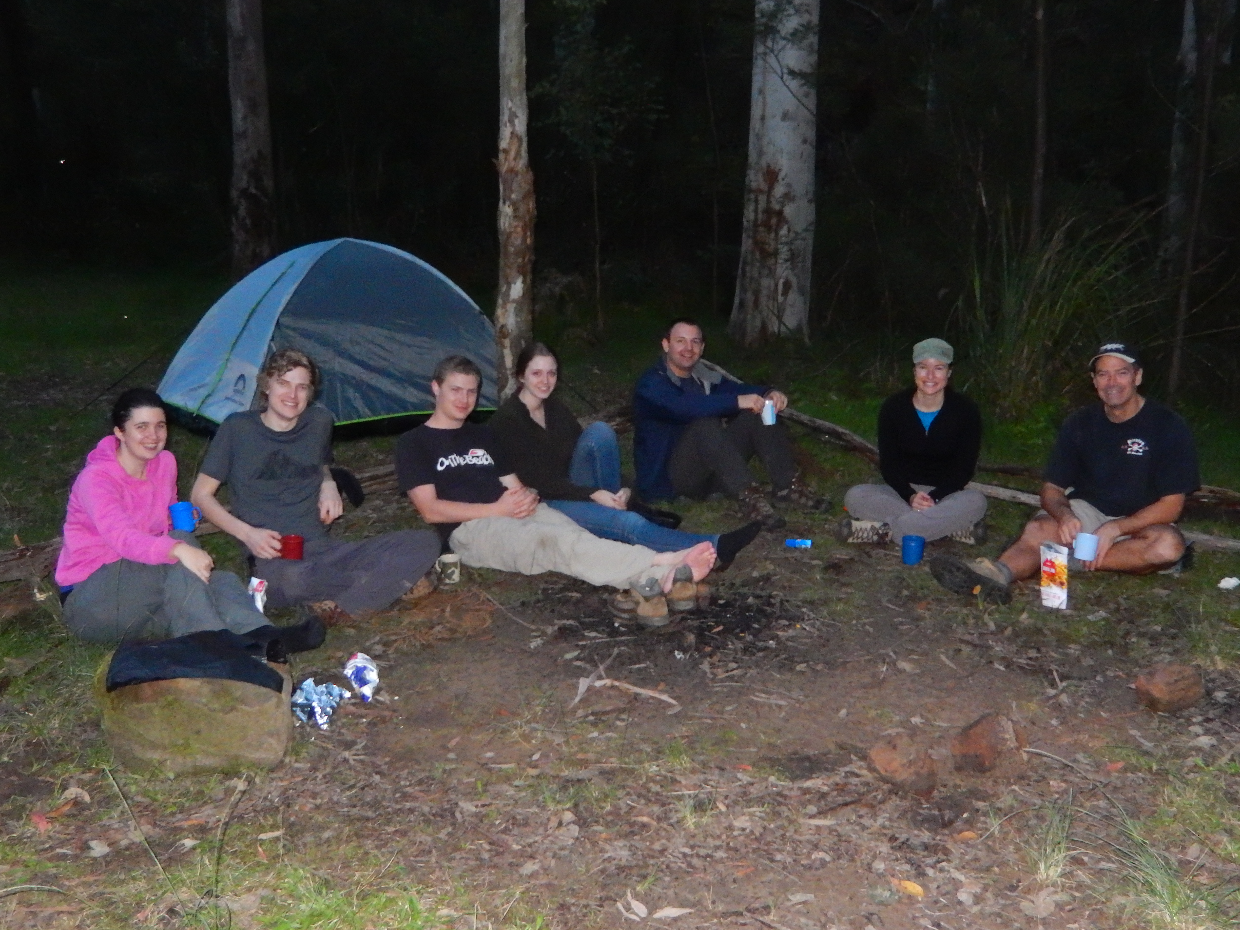 The combination of a beautiful setting surrounded by tall trees, a crackling fire and greatly appreciated red wine made for a great evening and a good sleep in our remote setting. Morning time brought us heavy dew, blue skies and sore shoulders but we were ready for our side trip to Blue Gum Forest and the goal for our weekend.