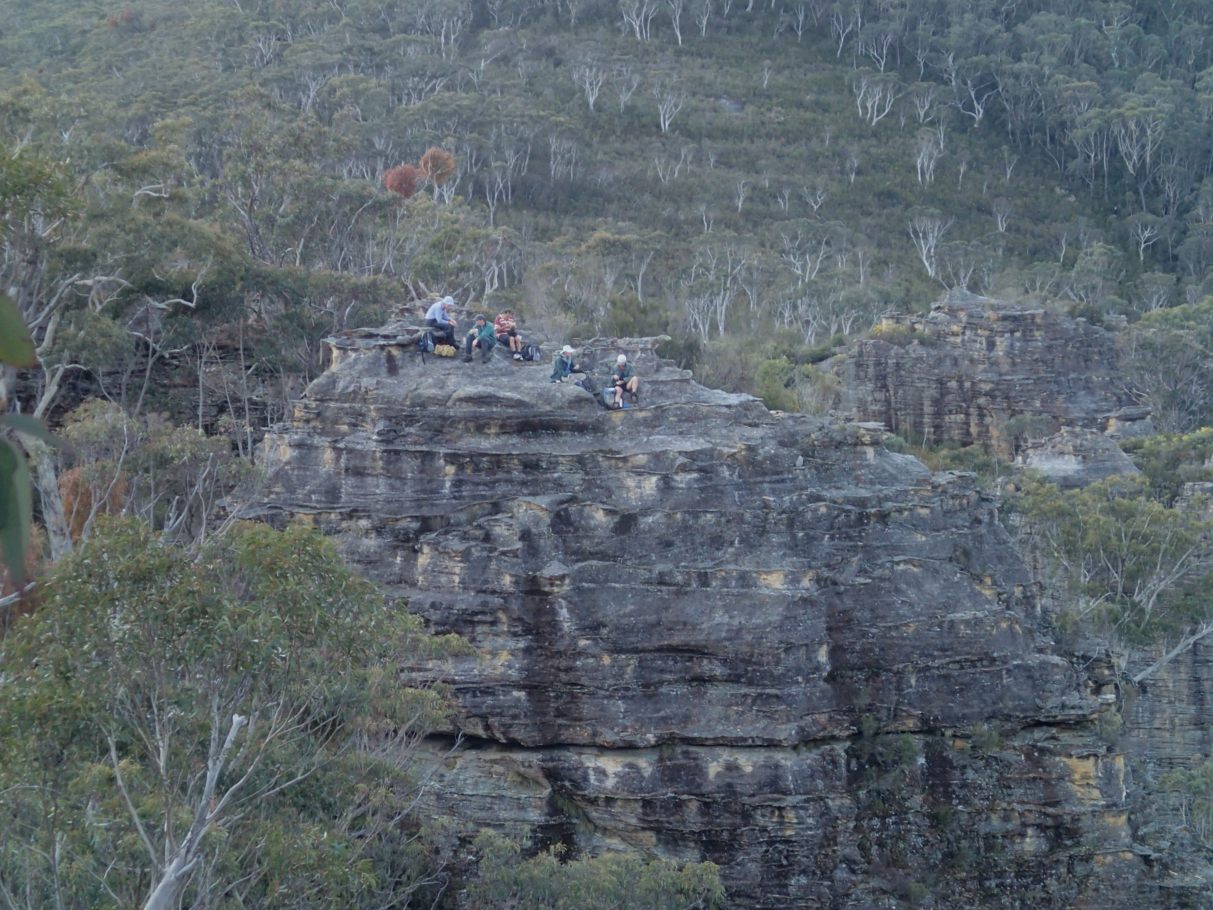 The weather for most of the day was variable with mood swings between hard rain and bright sunshine but the majority of the time it lingered somewhere in between. We bush bashed our way through the wet undergrowth and weaved our way through the gums until we made the ridge of the deep gorge formed by Deane’s Creek. Here we climbed a tall pagoda with its amazing contours carved by eons of weather, and enjoyed morning tea while we took in the vast views of the many large pagodas and the deep gorge below us.