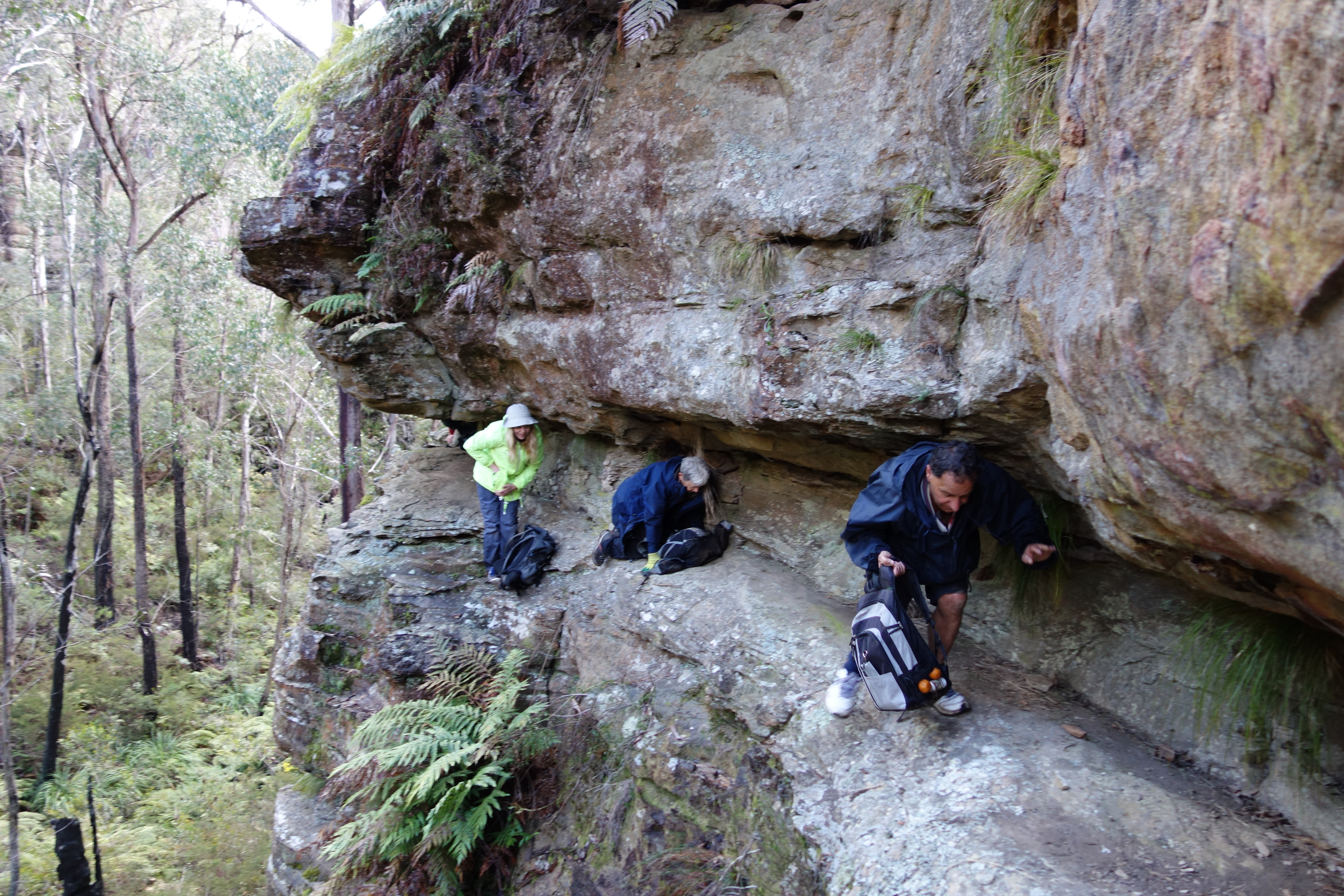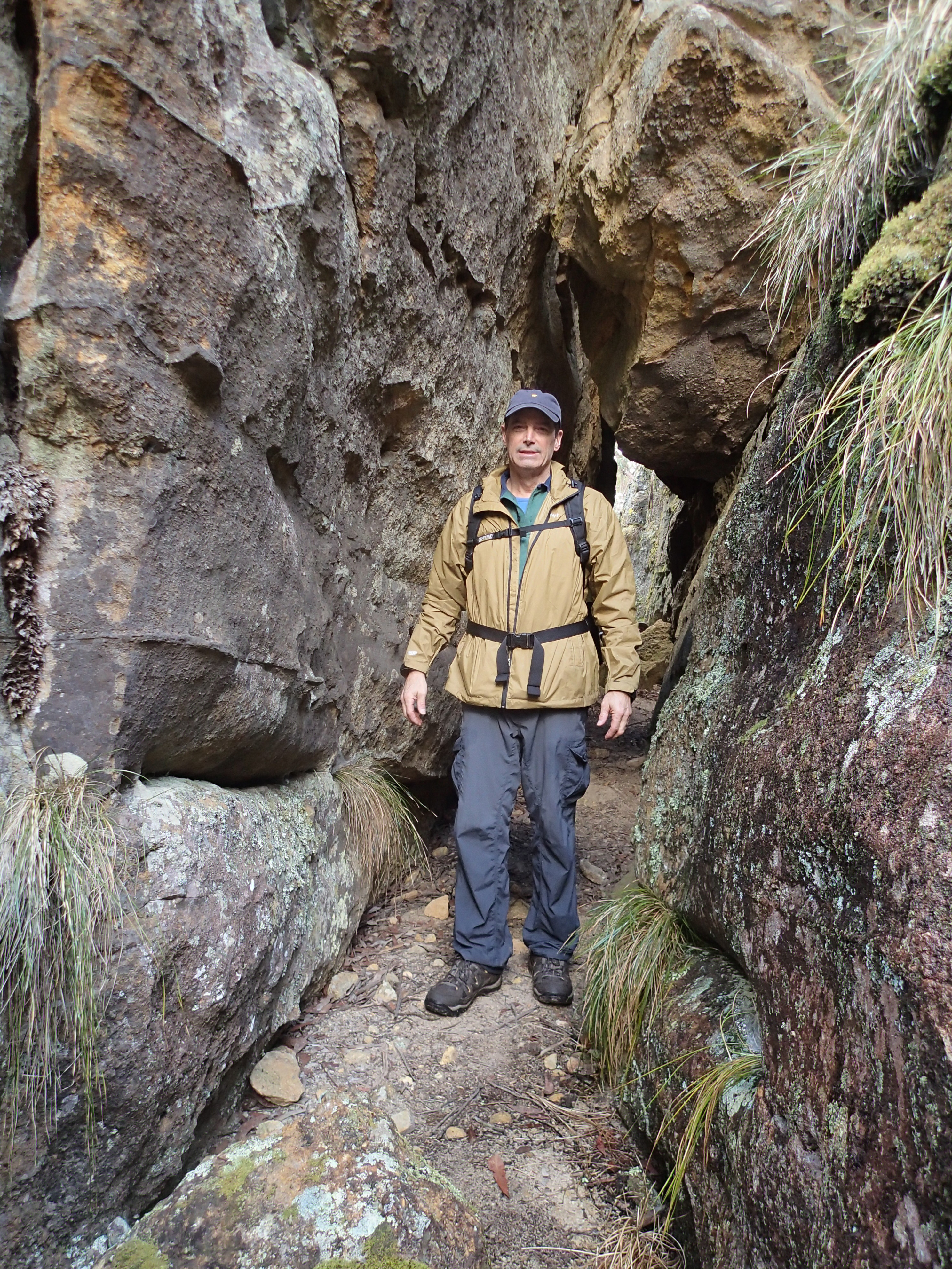 We then came to a narrow slot between two huge rock features which we had to pass through, followed by the trickiest part of the walk as we had to crawl along a very narrow ledge. With a hint of black humour this feature was quickly named the Ledge of Death. We took off our packs and slowly scraped our way along, trying hard not to slip off the ledge and at the same time not hit our head on the overhang. I managed to at least achieve one of those objectives.