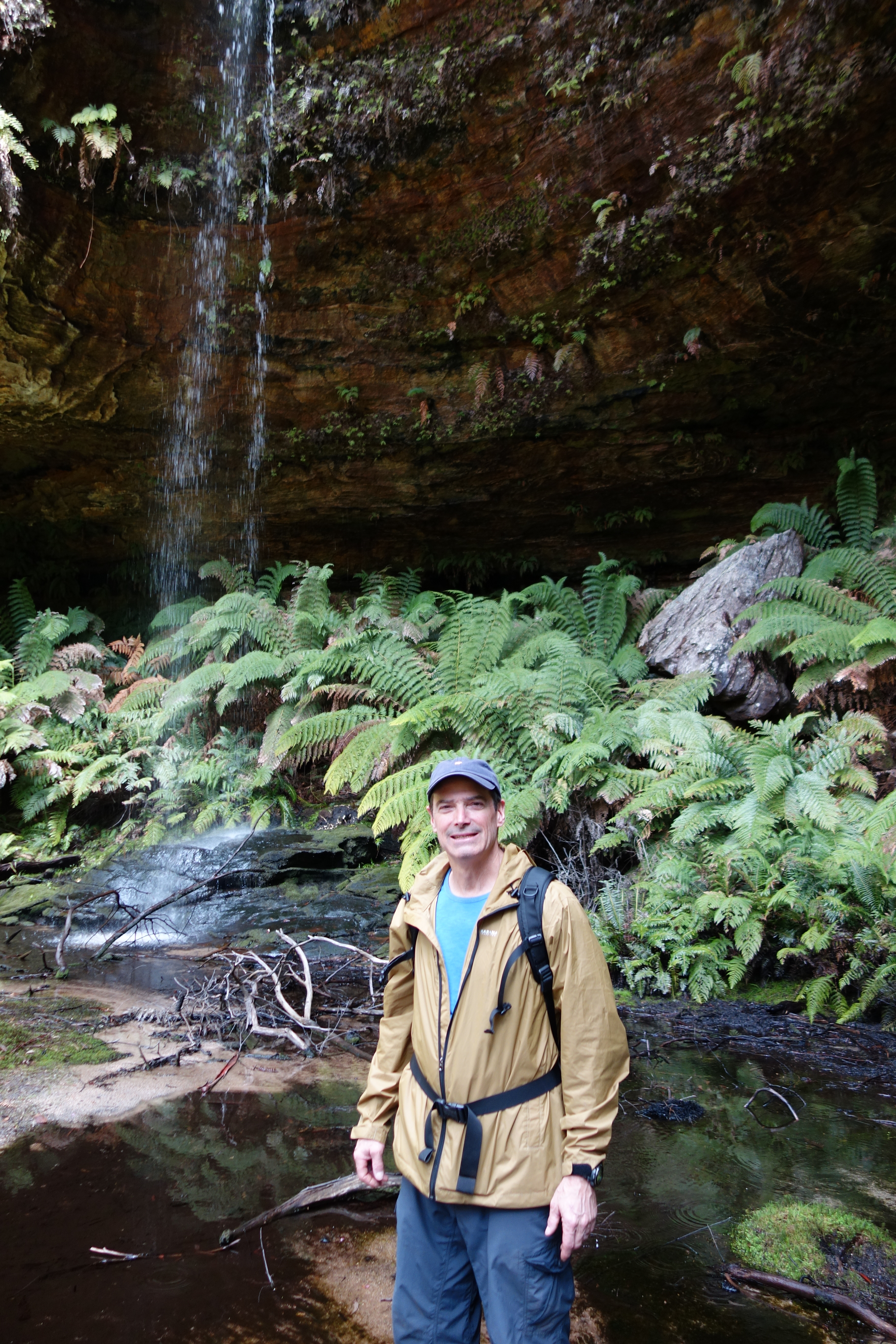 Our leader Chris had never been to the waterfall but had gotten us there following waypoints on his GPS (impressive stuff). Geoff, a fellow walker, wanted to explore some of the canyon beyond the waterfall and as we came around the corner we found a huge amphitheatre with vertical walls perhaps over 50 metres high and a floor of thick soft ferns. This amphitheatre, as immense as it was, was hidden from view and we speculated whether non-indigenous people had ever been here before. Yes, almost certainly some hearty explorer had stumbled on it at some time, for sure, but then again, you never know, maybe we really were the first ones…