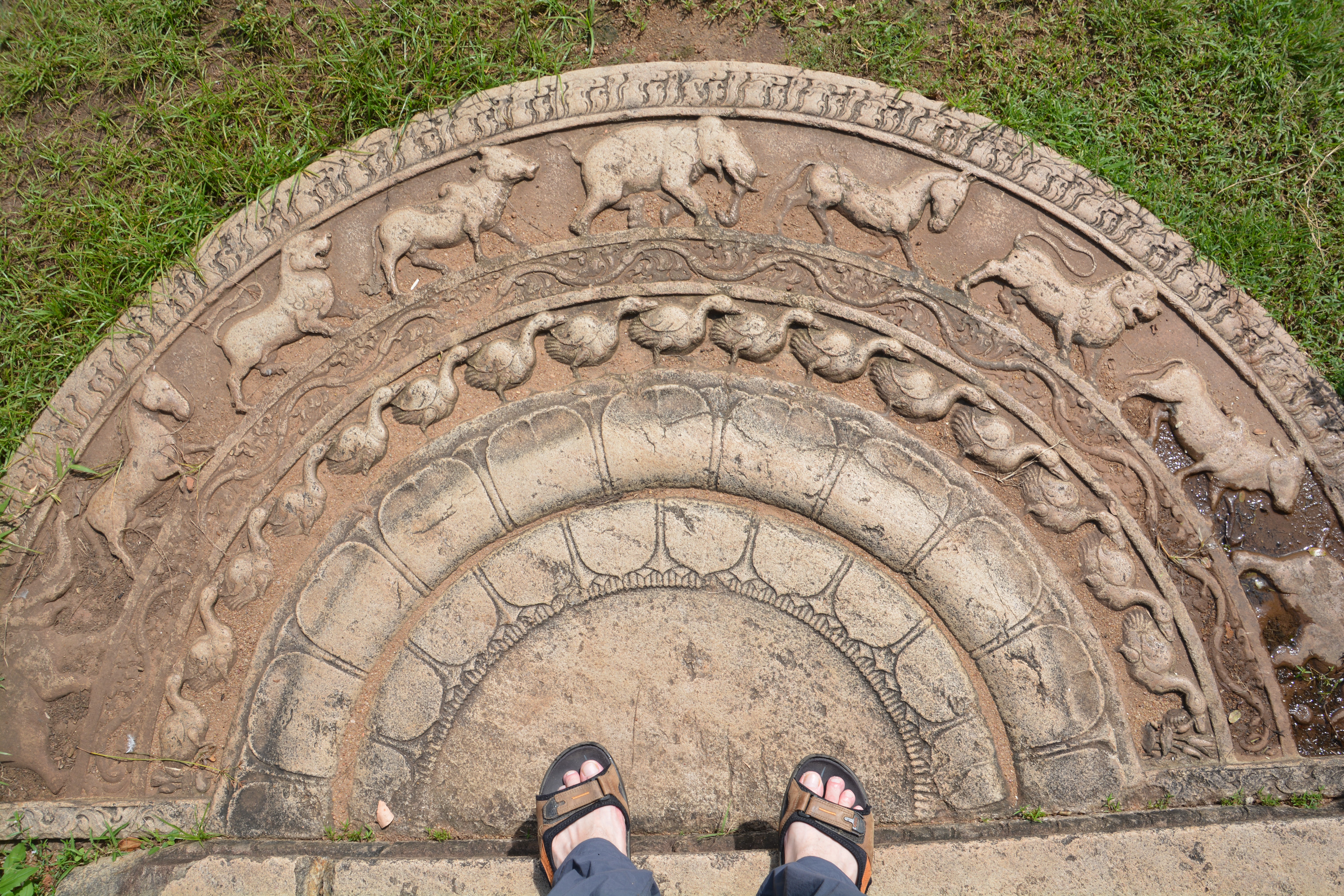 We also went to a nearby site which featured one of the best examples of a moonstone. A moonstone is basically a large stone forming a semi-circular first step into an important building. These moonstones feature spectacular carvings of four major animals lining the top line – elephants, lions, buffaloes and horses – with other rows showing geese or other images, adorn the footstep of a 9th century school. We’d never seen anything like these timeless carvings and yet in most cases we could walk across them without any restrictions.