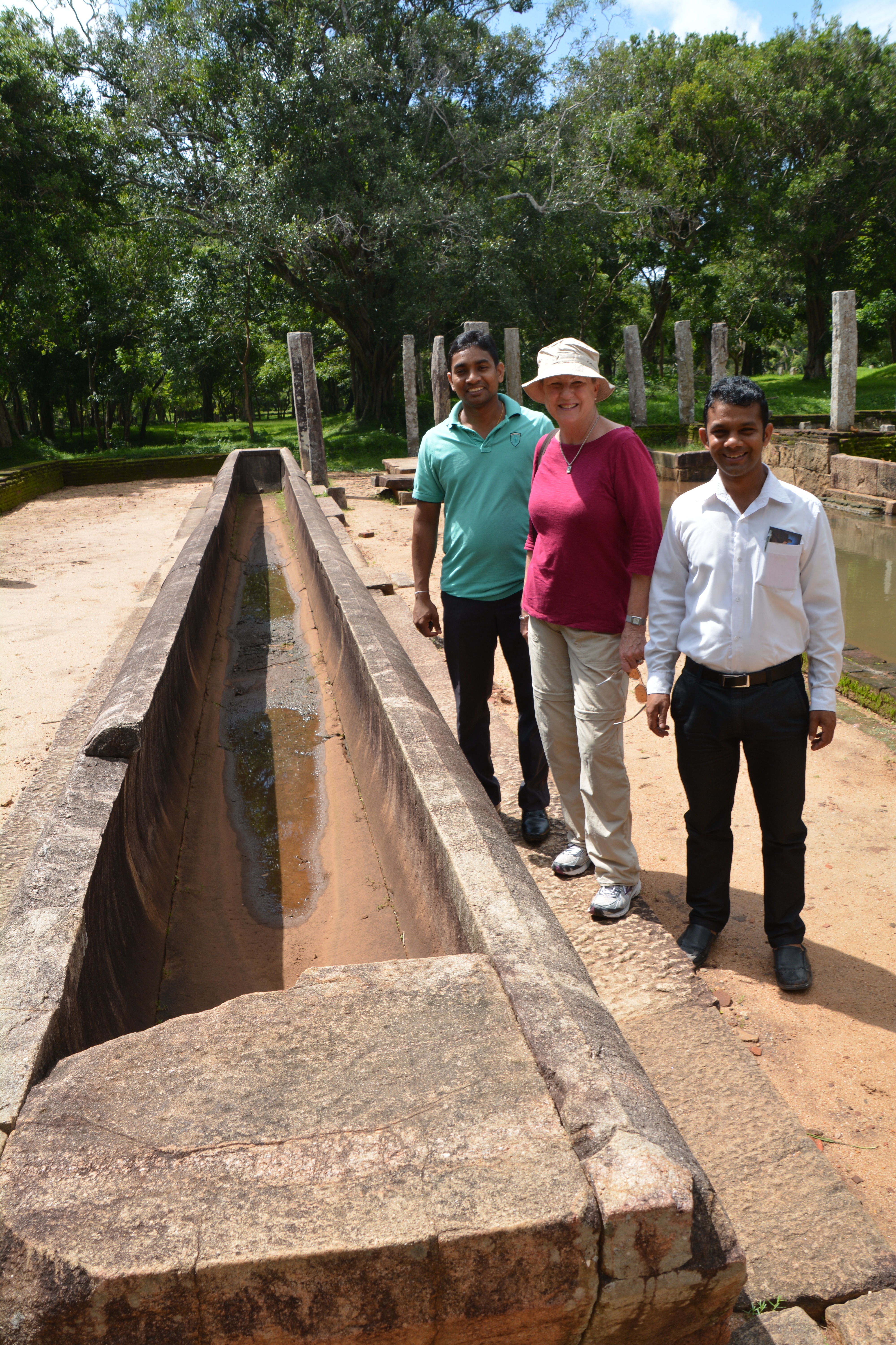 Our driver Mr. T, Julie and our local guide for the day Mr. D stand next to a long trough which was used for preparing rice for the monks