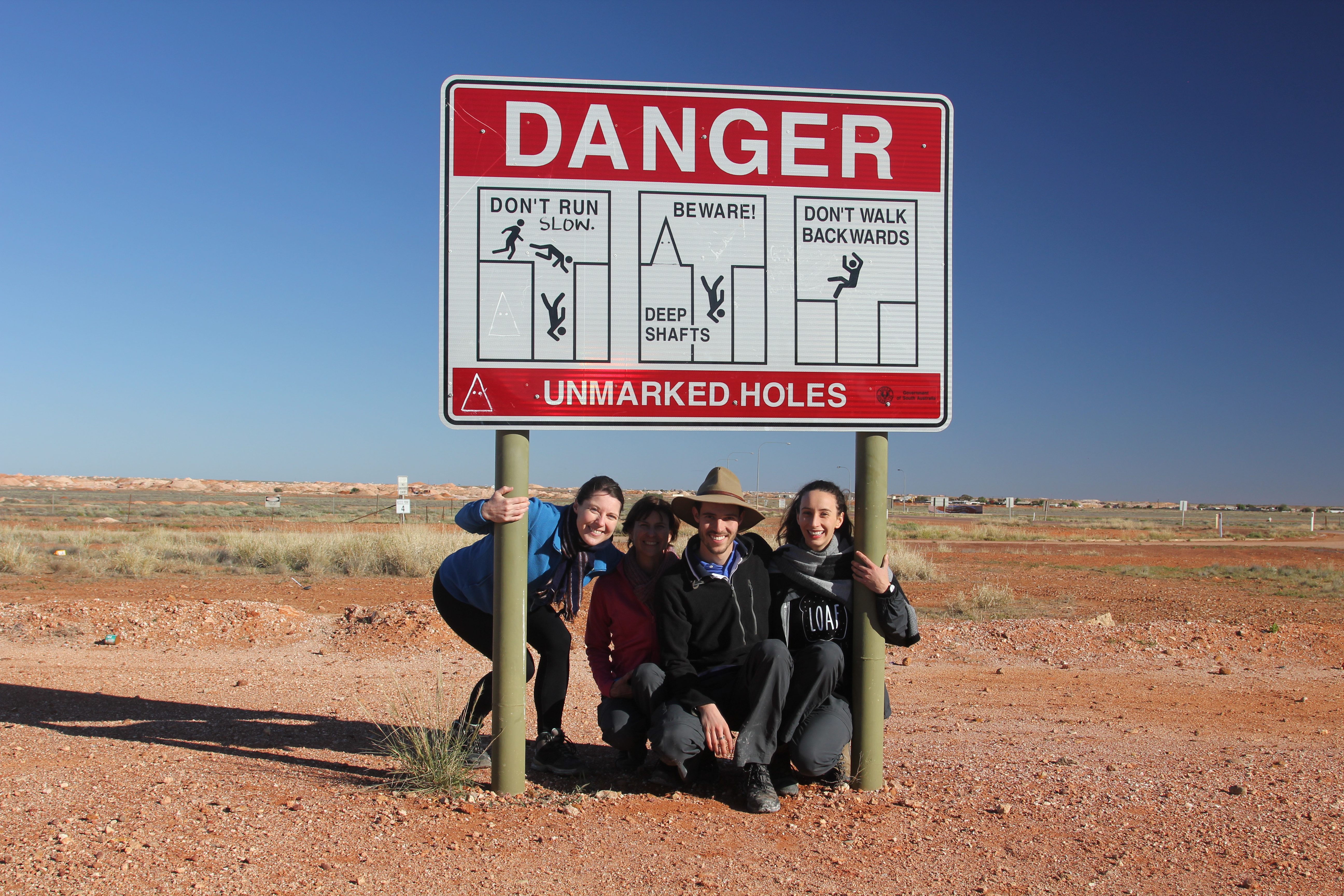 The next morning we drove into Roxby Downs to refuel and admire this modern community built by the huge mining company BHP to house their workers and their families, then drove to the end of the paved road to start our off-road adventure. It was a clear Monday morning, everyone was buzzed to start and all systems were go. But wait, unbelievably, the huge sign at the start of the dirt track said it was closed all the way up the famed Oodnadatta Track, which was to be our path for the next couple of days.