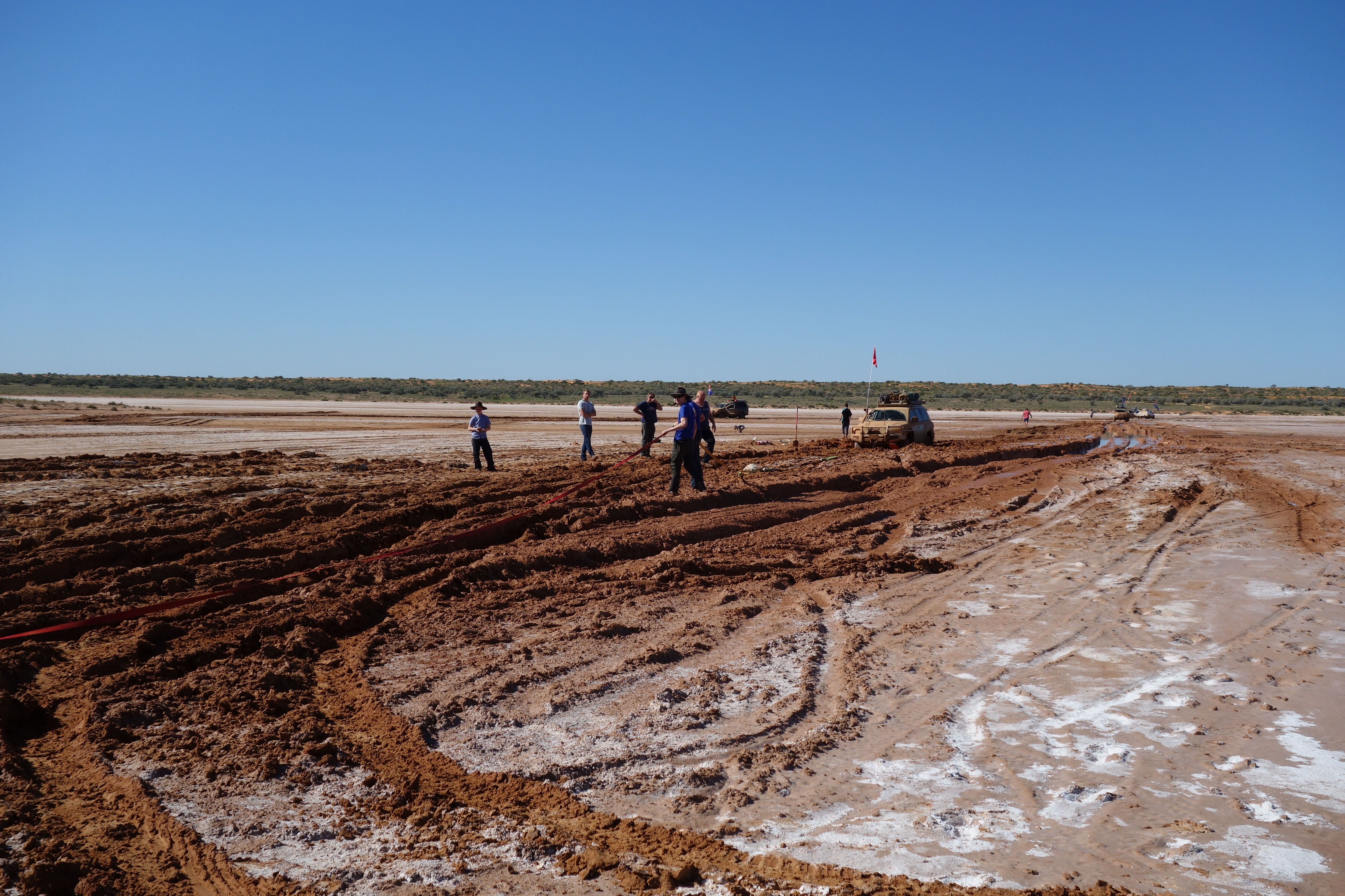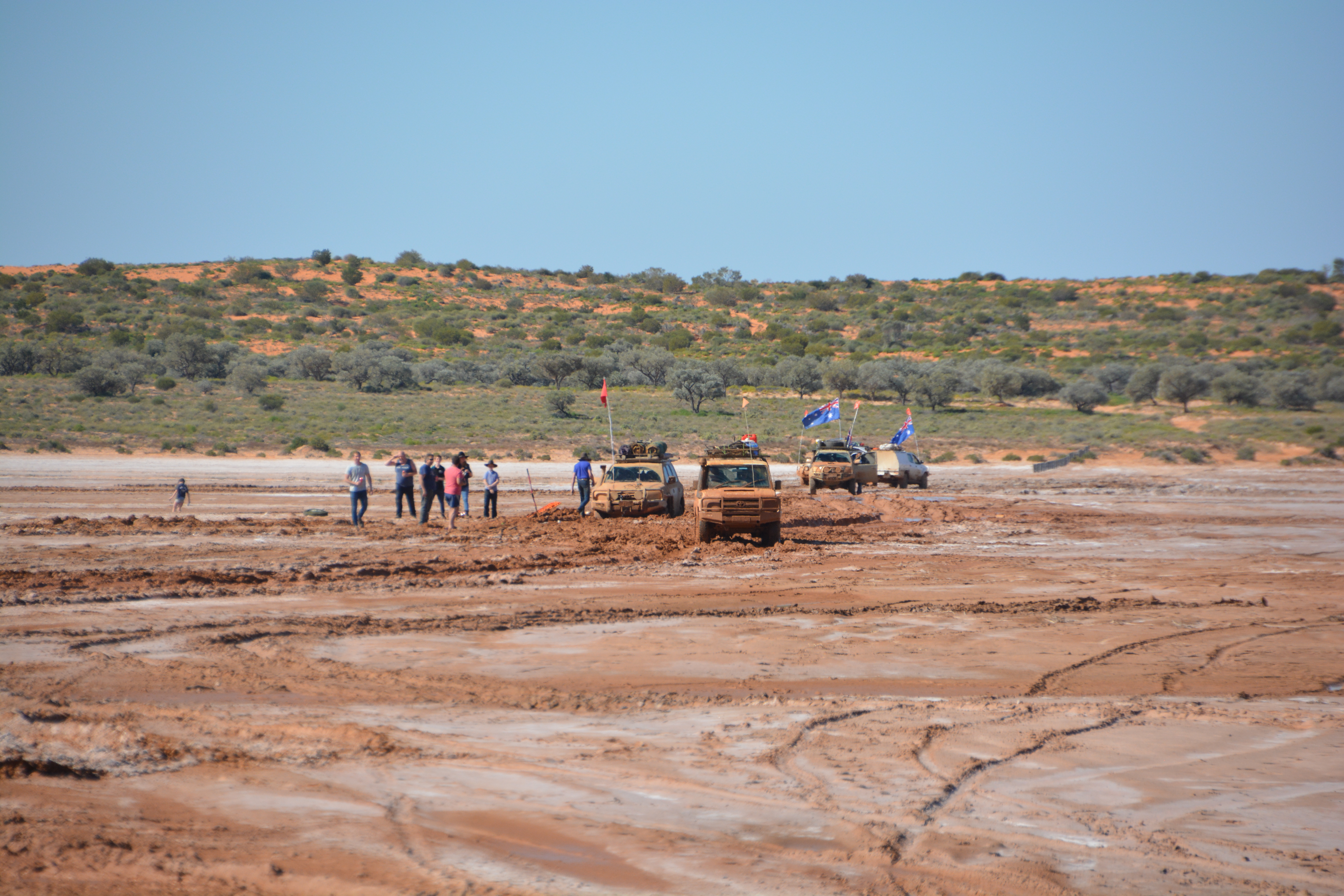 We averaged only about 14 km per hour for the first three hours, finally arriving at Poeppel Lake – a huge dry salty lake bed – near midday. This salt bed was more than a kilometre wide, deeply rutted from past travellers and obviously very boggy in the middle. And this is where we saw the truck stuck in the middle of the lake, hopelessly bogged with his four kids inside. Of course as soon as we crested the dune the radio crackled with a request to help them get out, relying on an unwritten traveller’s creed to help each other in times of need.