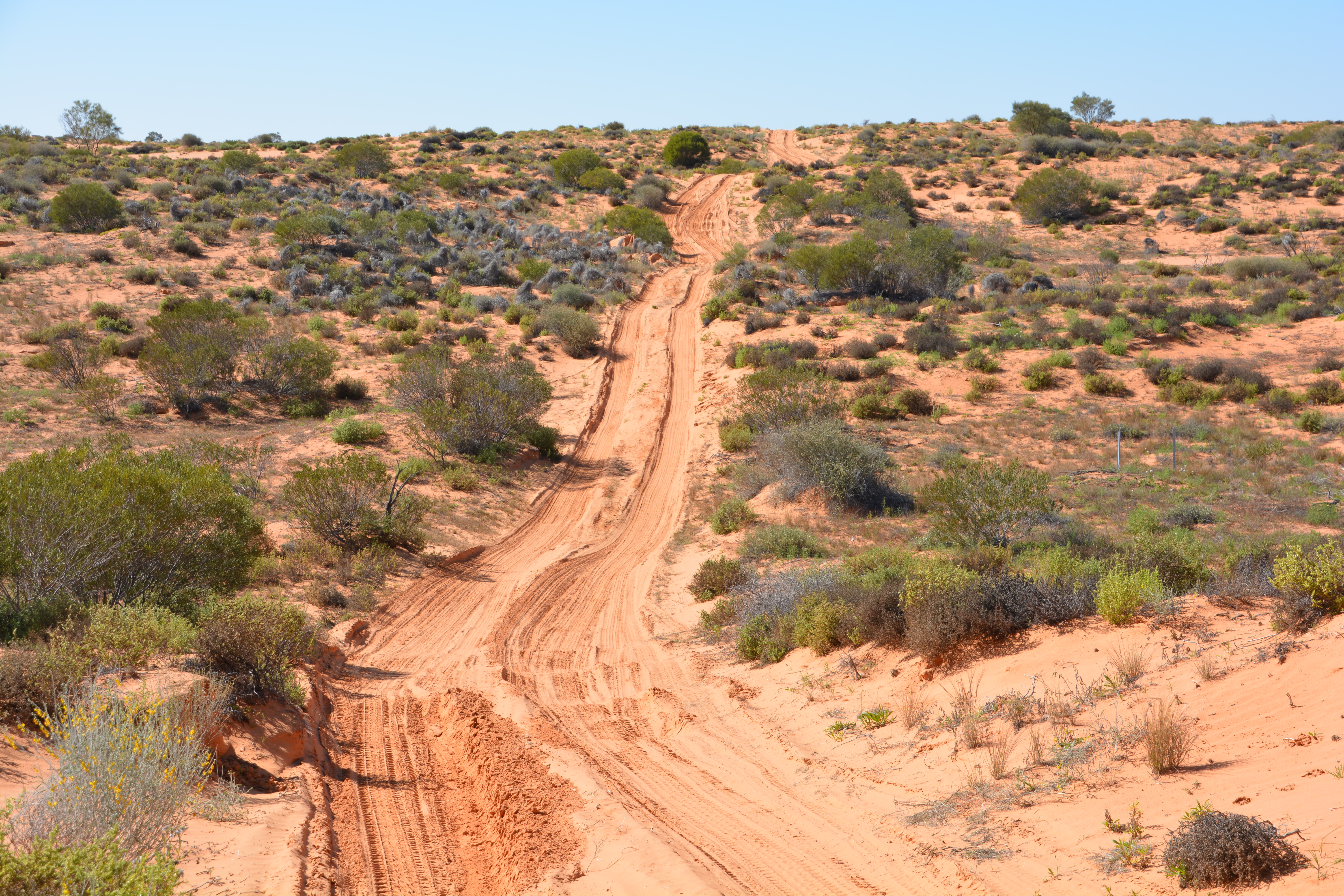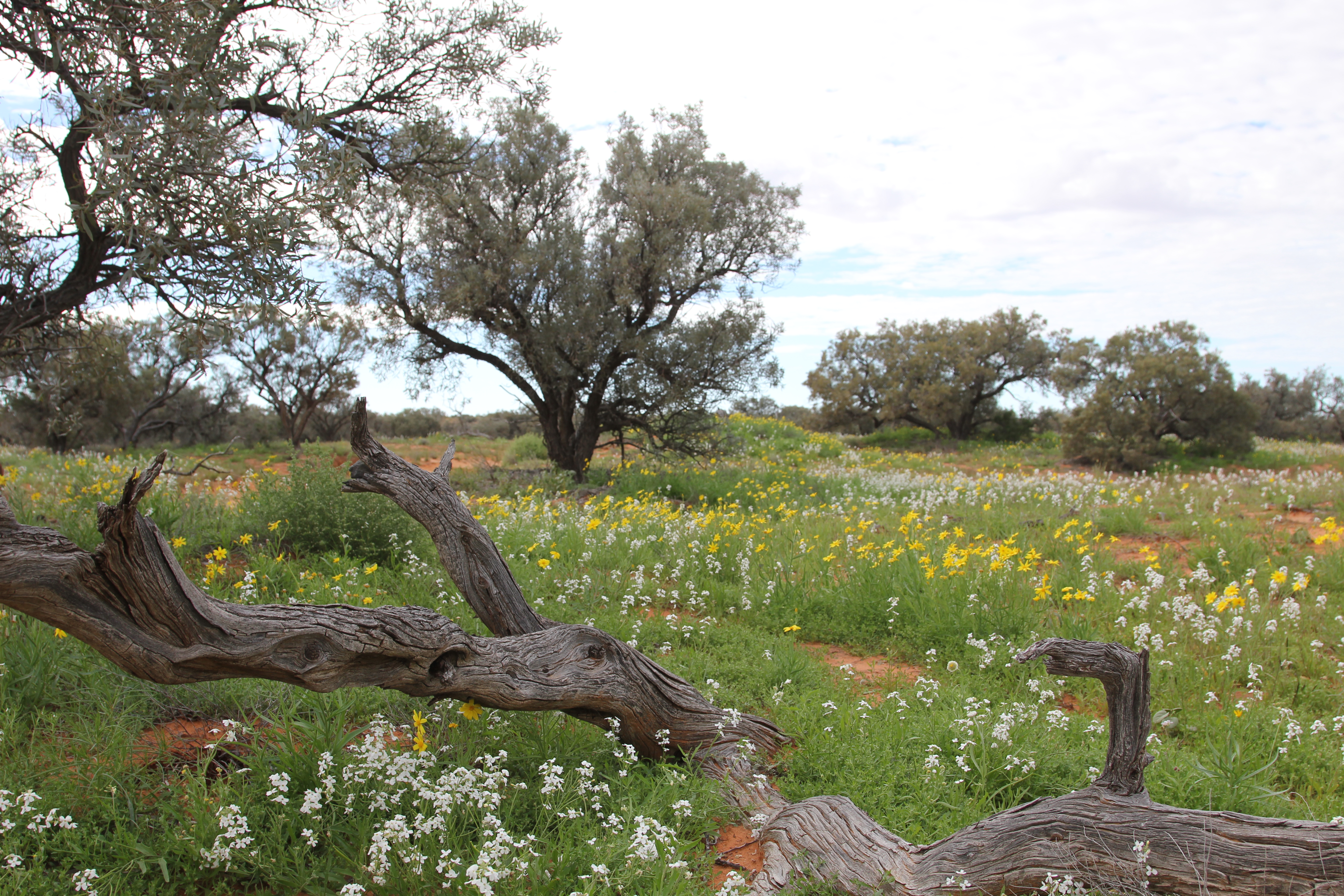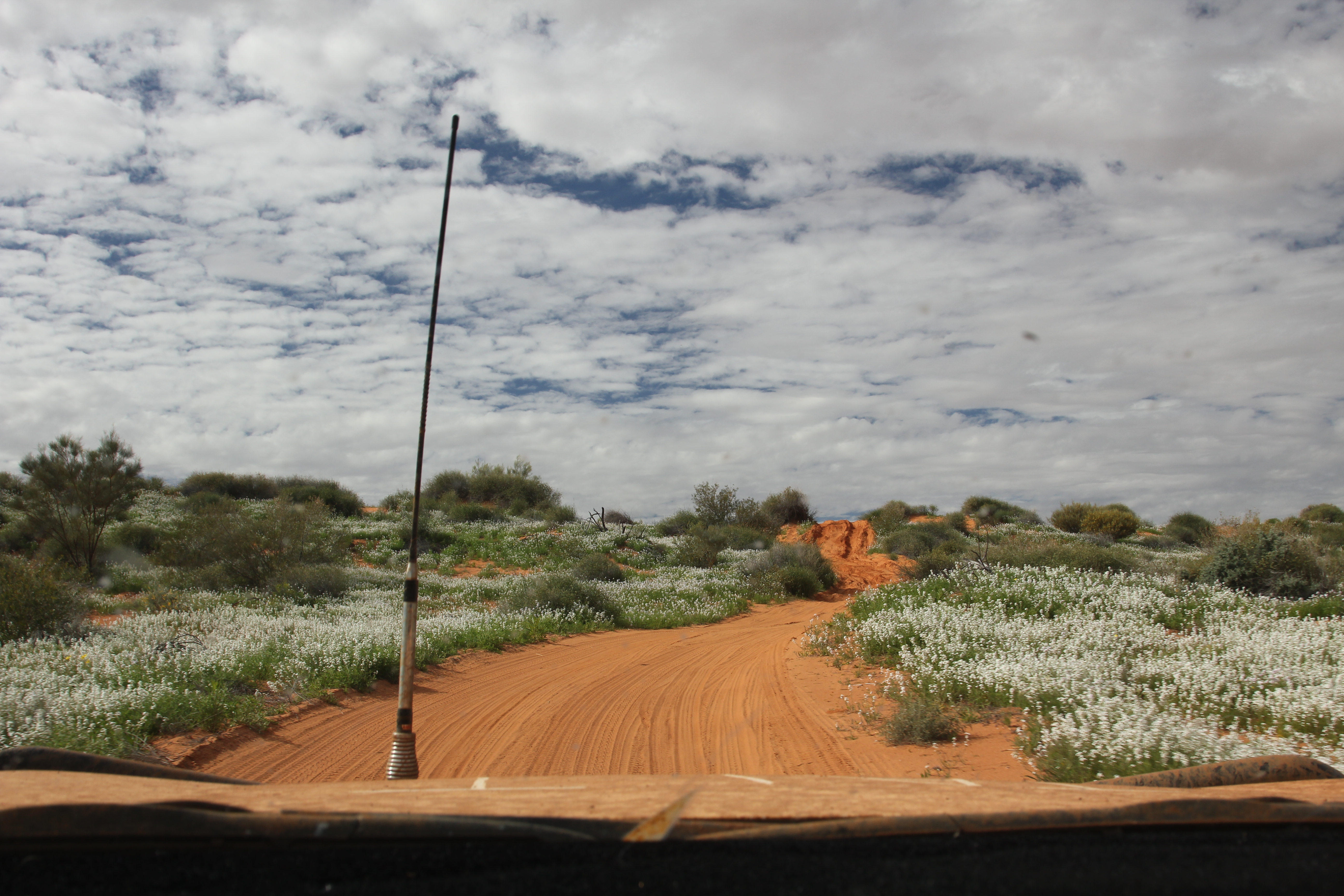Our sand dunes this morning were not just their normal green with the red sand underneath. From a distance these dunes took on a vibrant yellow, white or even tinges of purple. The dunes were covered in fields of flowers, waves of them across the sand, as far as we could see, sometimes so thick that the white flowers looked like freshly fallen snow. We stopped many times for photos, each sand dune outdoing the previous one for its bright colours against the blue skies. Absolutely stunning stuff.