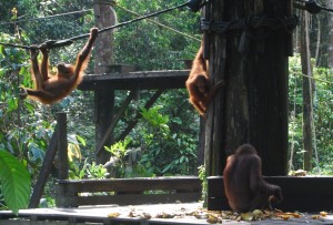 We walked out on the boardwalk to the feeding platform (with many other tourists) to see half a dozen of the big hairy orange apes get their free servings of bananas and other fruit. These animals live wild in the 40 acre centre but learn quickly to be nearby at feeding time.