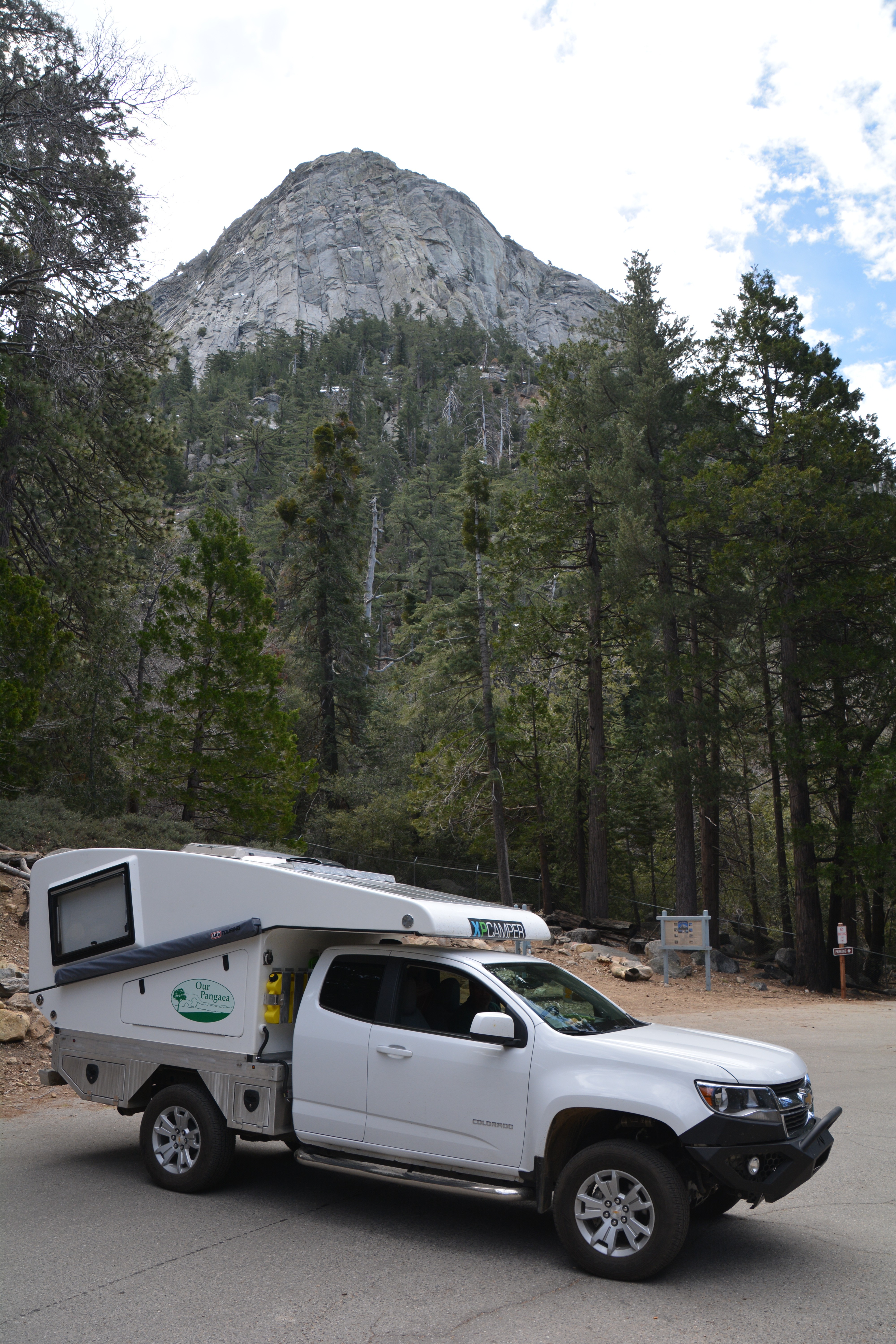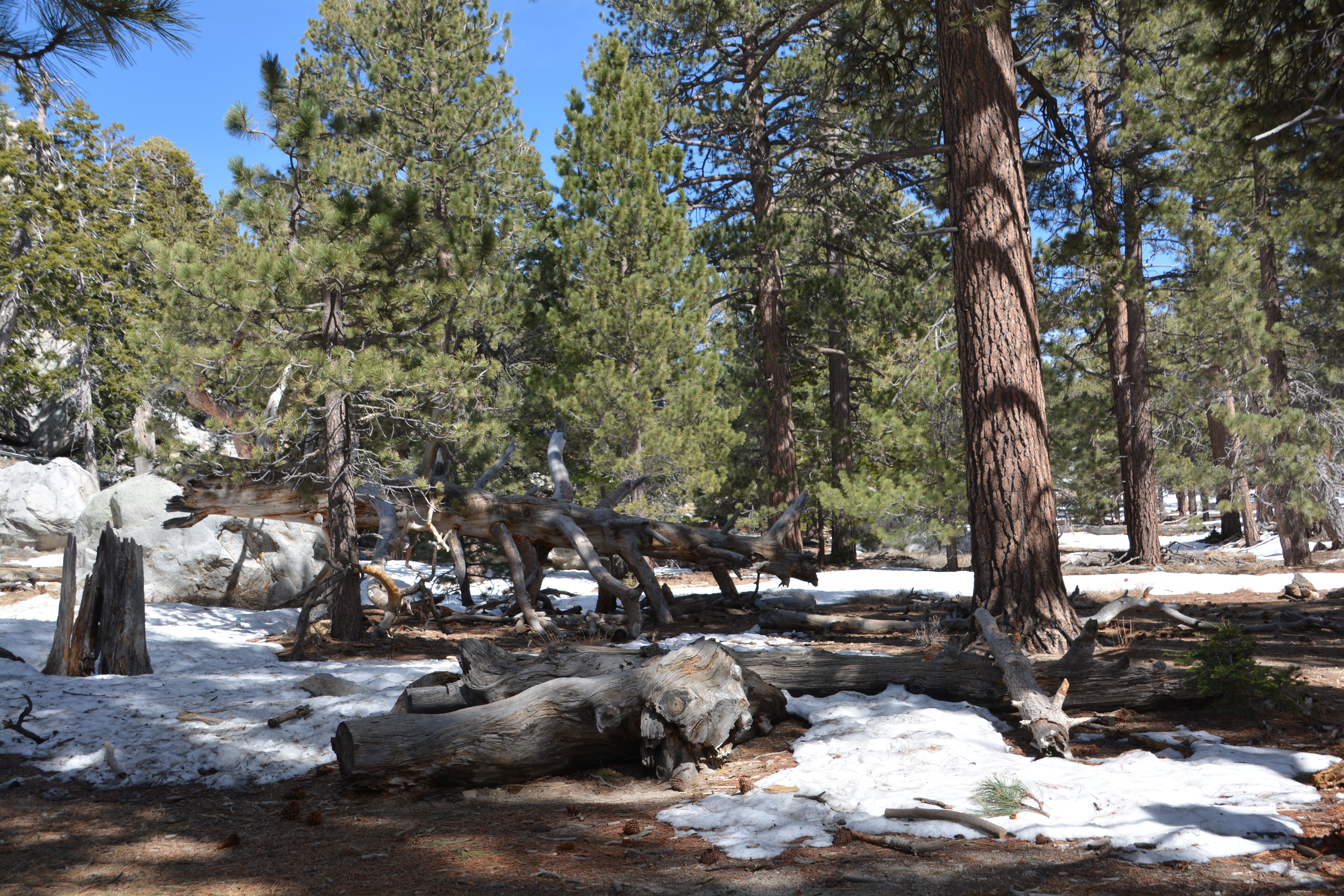 In another example of engineers defying logic, a narrow winding road rose almost vertically from the valley floor, following a crazy series of dramatic switchbacks and providing stunning views down on the cities and Interstates below. Almost ignoring the laws of gravity the road rose over 2,00 feet, then 3,000, then 4,000, on to 5,000 feet and finally entered rich pine forests over 6,000 feet in a drive of less than four miles. It topped out around 6,100 feet but of course by this stage there was snow on the ground and all the campsites were still closed for the winter so we were forced we pushed on.