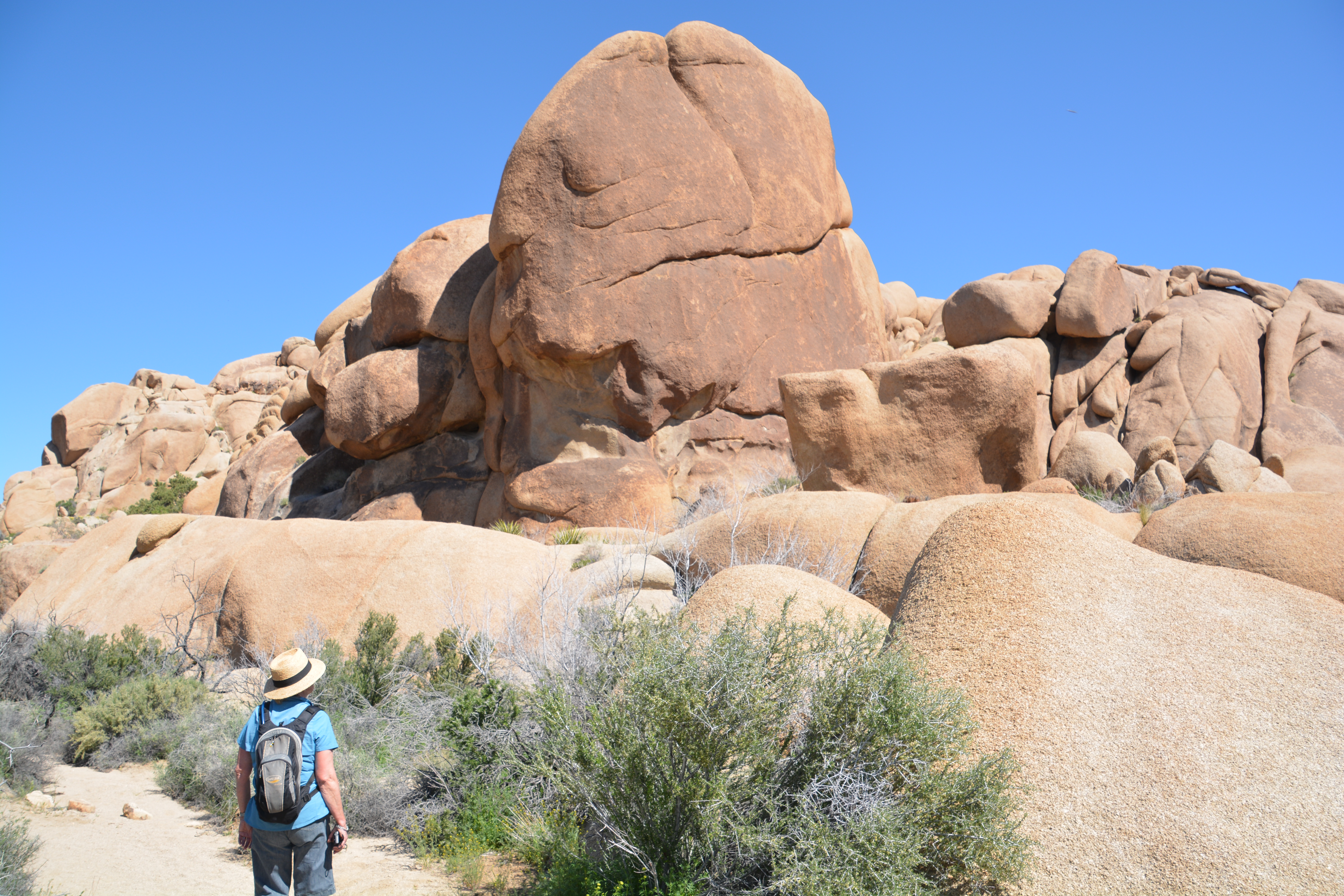 Joshua Tree NP is famous for the fascinating and highly photogenic Joshua tree cactus but it also feature a fabulous range of huge smooth granite boulders formed eons ago and which today rise up to dominate the desert landscape. We walked amongst these rough granite giants and an uncountable range of beautiful cacti for a few hours in temperatures around 82F/28C but with a light desert breeze that made it a bit more bearable.