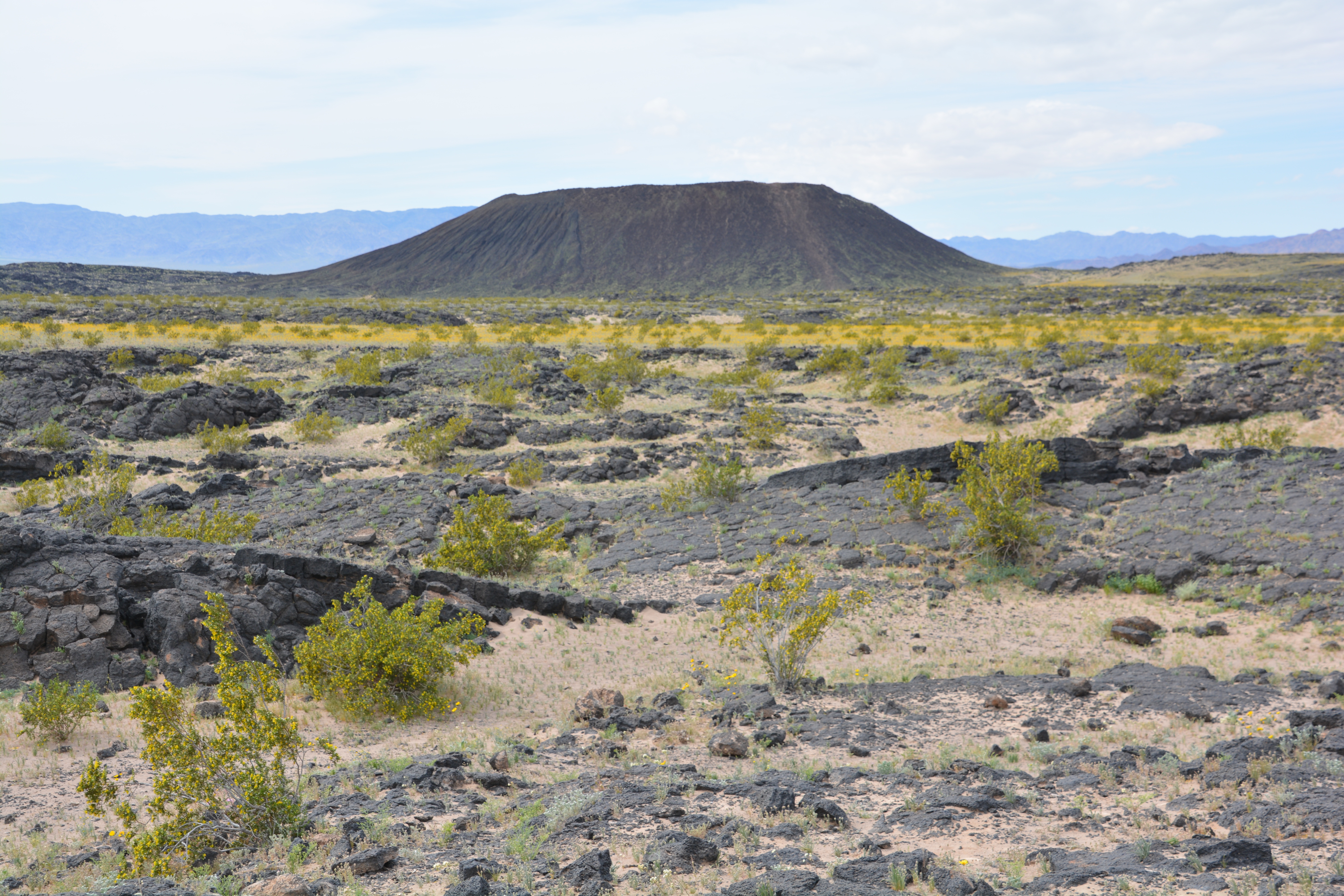 But our plan was to move north to Mohave National Preserve, a huge stretch of desert landscape that begged us to explore it. We followed straight desert roads over mountain ranges and across barren landscapes, eventually crossing the dry Bristol Salt Lake and finding the Amboy Volcanic Crater National Monument. This dramatic volcanic crater rises from the desert flow with its distinct lava flows across the valley and covered in a variety of beautiful desert flowers. Very cool.