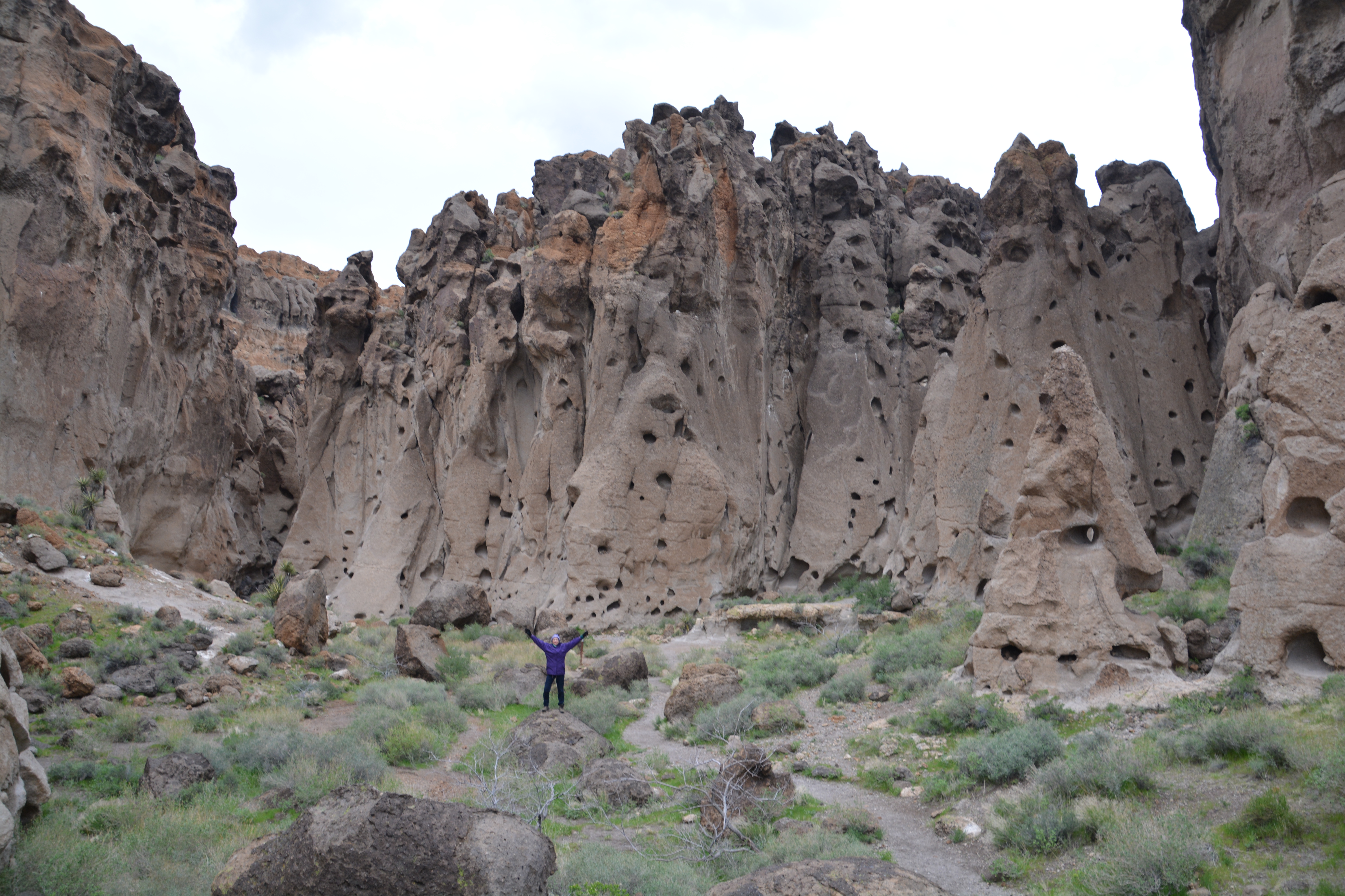As the rain stopped and the afternoon sun dropped to the edge of the canyon walls we followed a trail around dramatic red rock mountains, formed through a series of ancient volcanic ash explosions that provided layer after layer of hardened ash that was further formed by wind and weather. There was a narrow gap in the walls called Banshee Canyon which we climbed through, clamouring over amazing rock formations and using chain rings to help get up a few spots. We had the canyon to ourselves and soaked in this fascinating place.