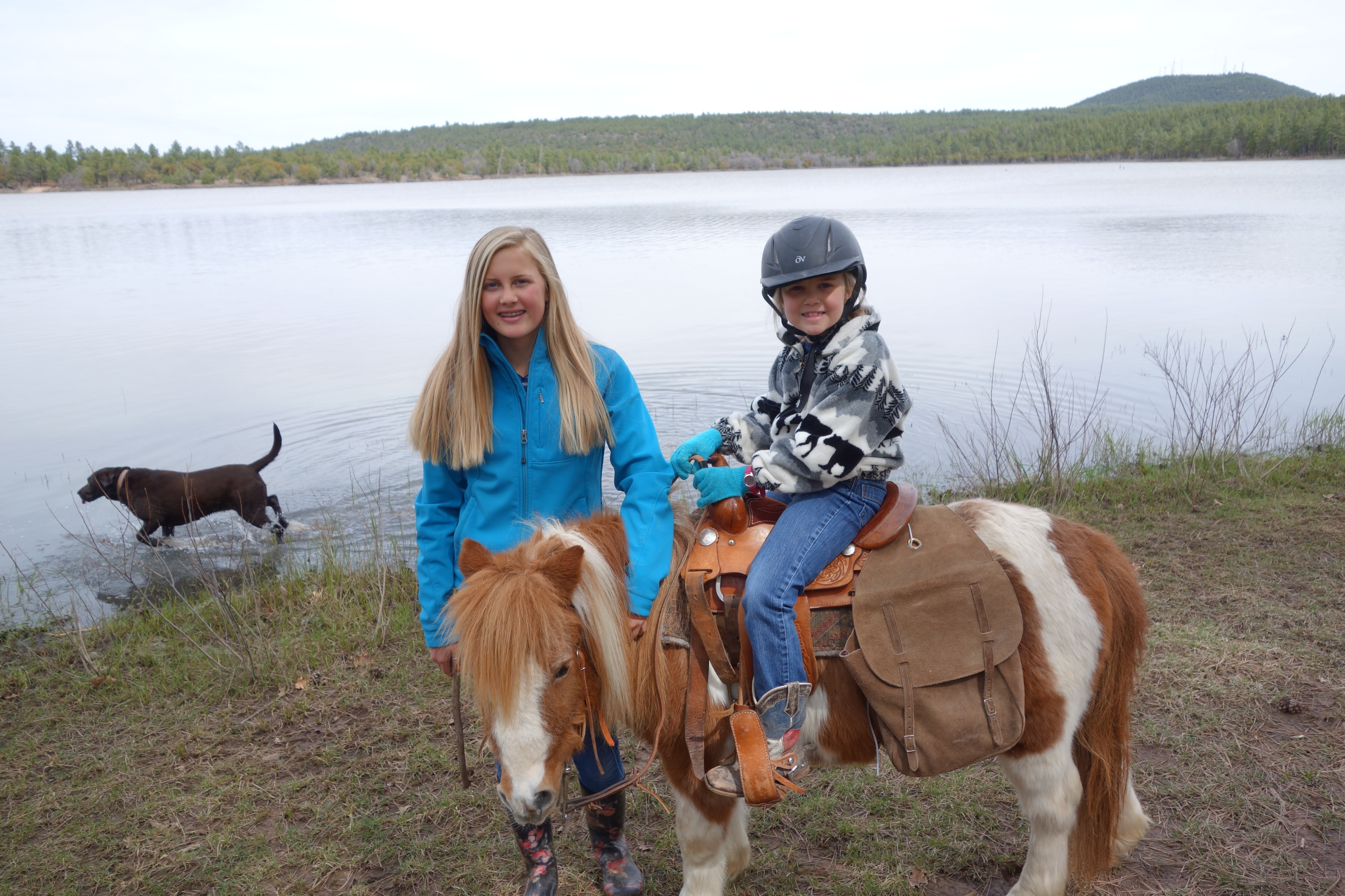 Megan and her little sister Ellie pose with the family pony Mudbud with one of the family dogs Penny splashing in the background