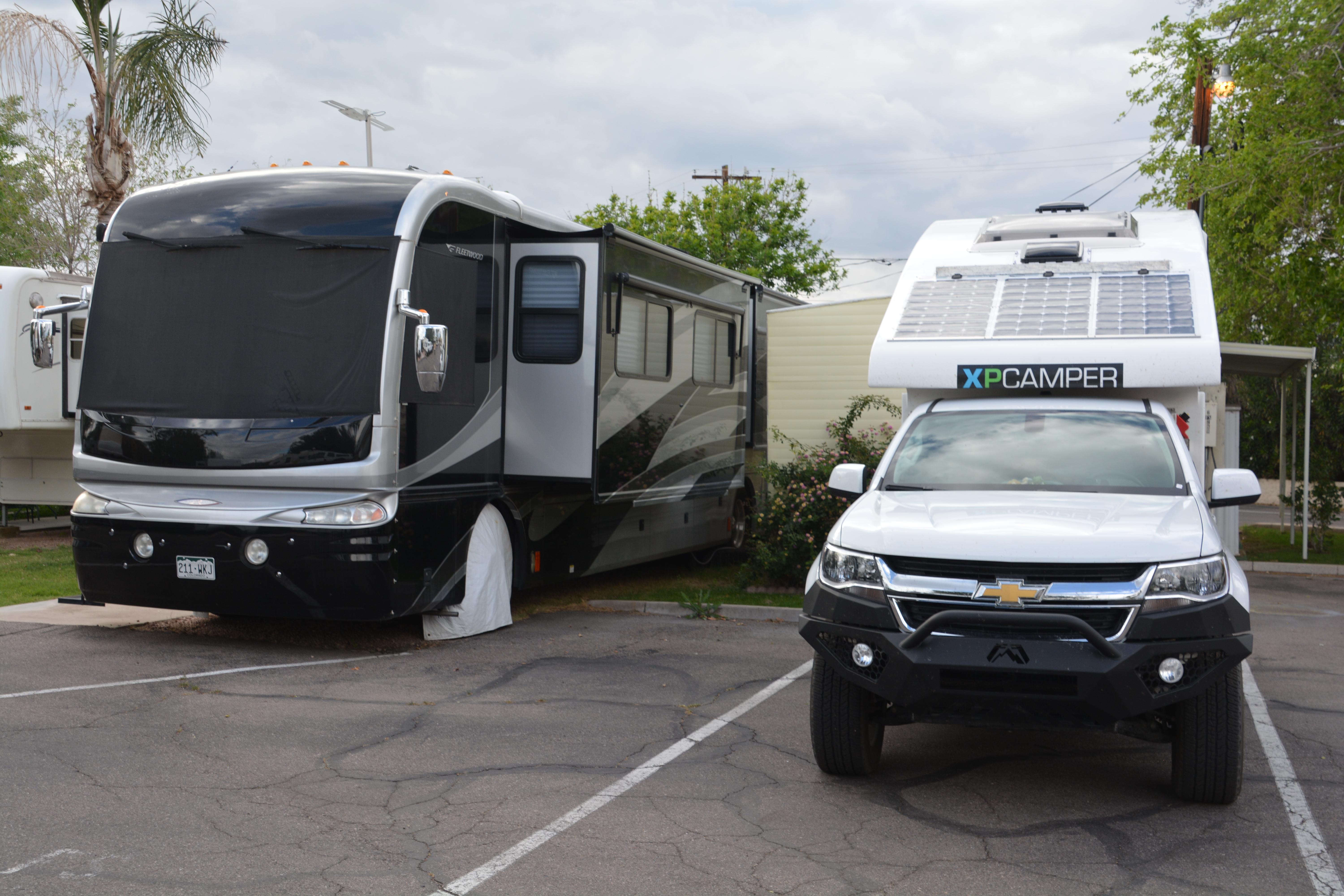 Tramp is dwarfed by one of the many huge RVs we see on the road – this time in the Scottsdale Trailer Corral