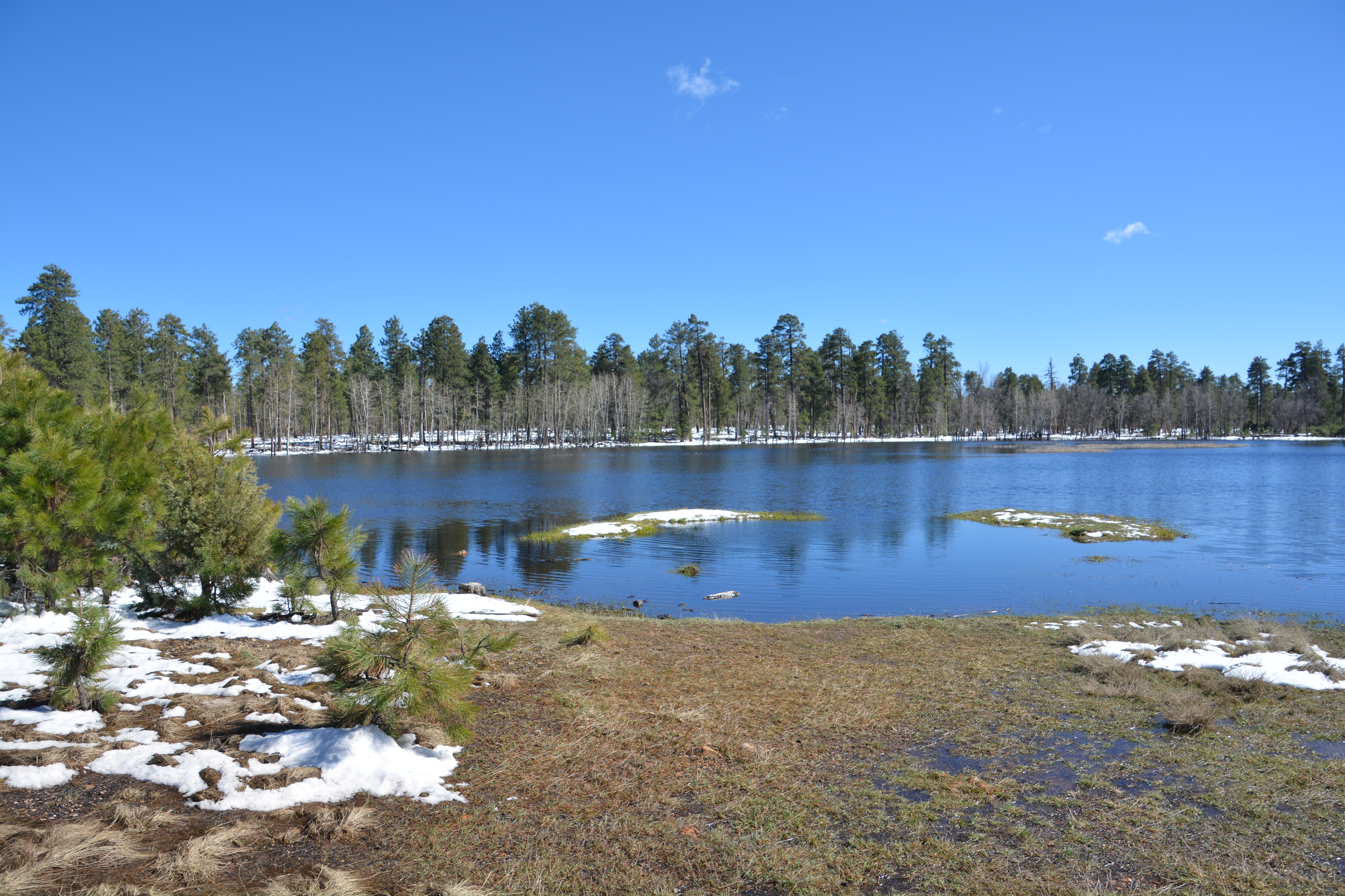 We first passed through the Apache Indian Reservation, beautiful land high in the Apache-Sitgreaves National Forest, with snow patches still on the ground and the spring grasses starting to grow. At one mountain pass of 9,026 feet (2,911 metres, our highest point on this trip so far) with a ski resort nearby Tramp was forced to come to a screaming halt as a huge big horn sheep was grazing on the road’s edge. His giant horns curled up and around the sides of his head and he carried a calm gracefulness as he looked at us. This was a special treat and we got out to admire this beautiful beast as he went about his breakfast.