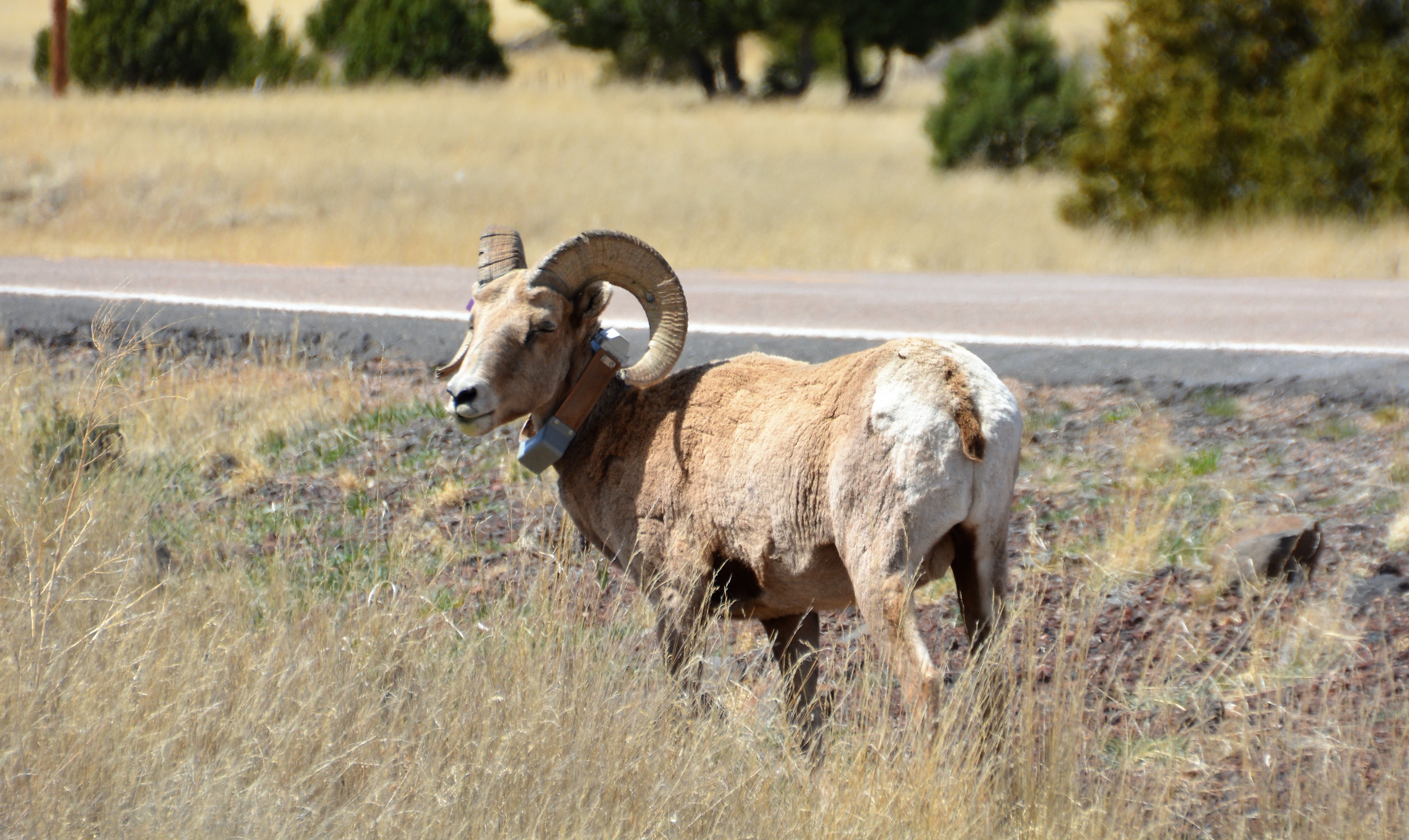A large big horn sheep grazed by the side of the road as we admired his huge horns – notice his collar acting as a tracking device