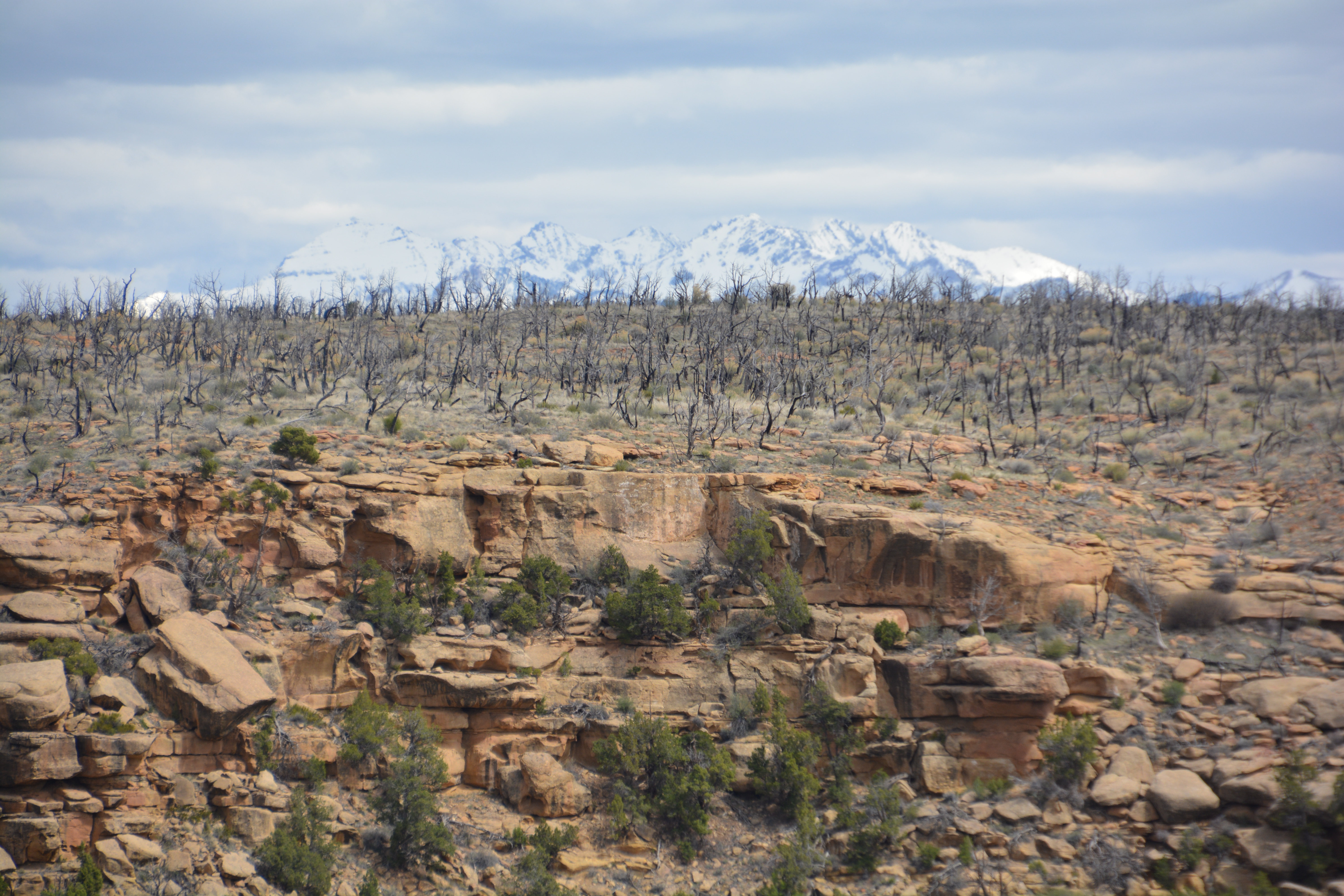 We enjoyed this scene – the top of the valley’s escarpment wall, the burned out desert from a recent fire and the snow capped mountains in the back