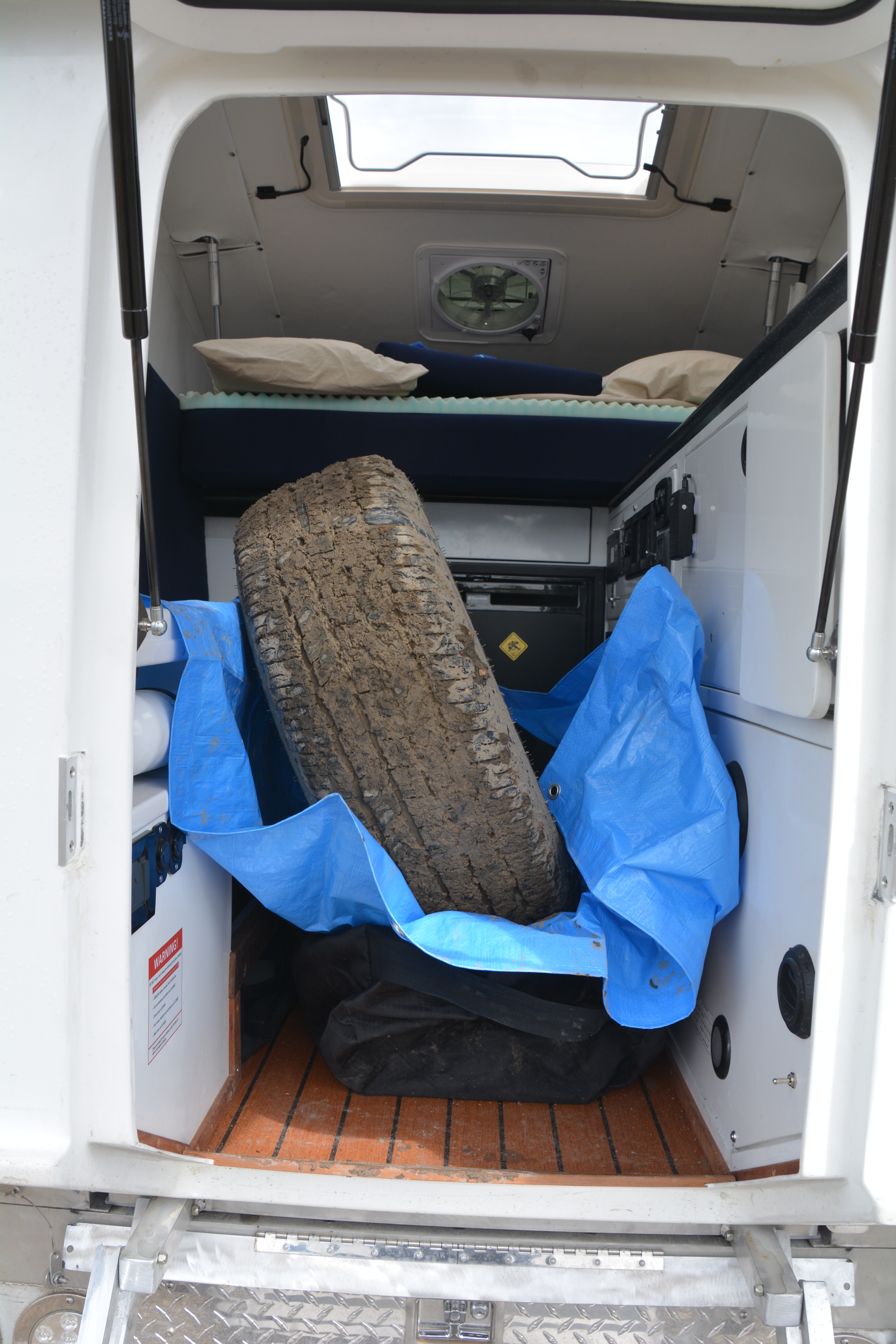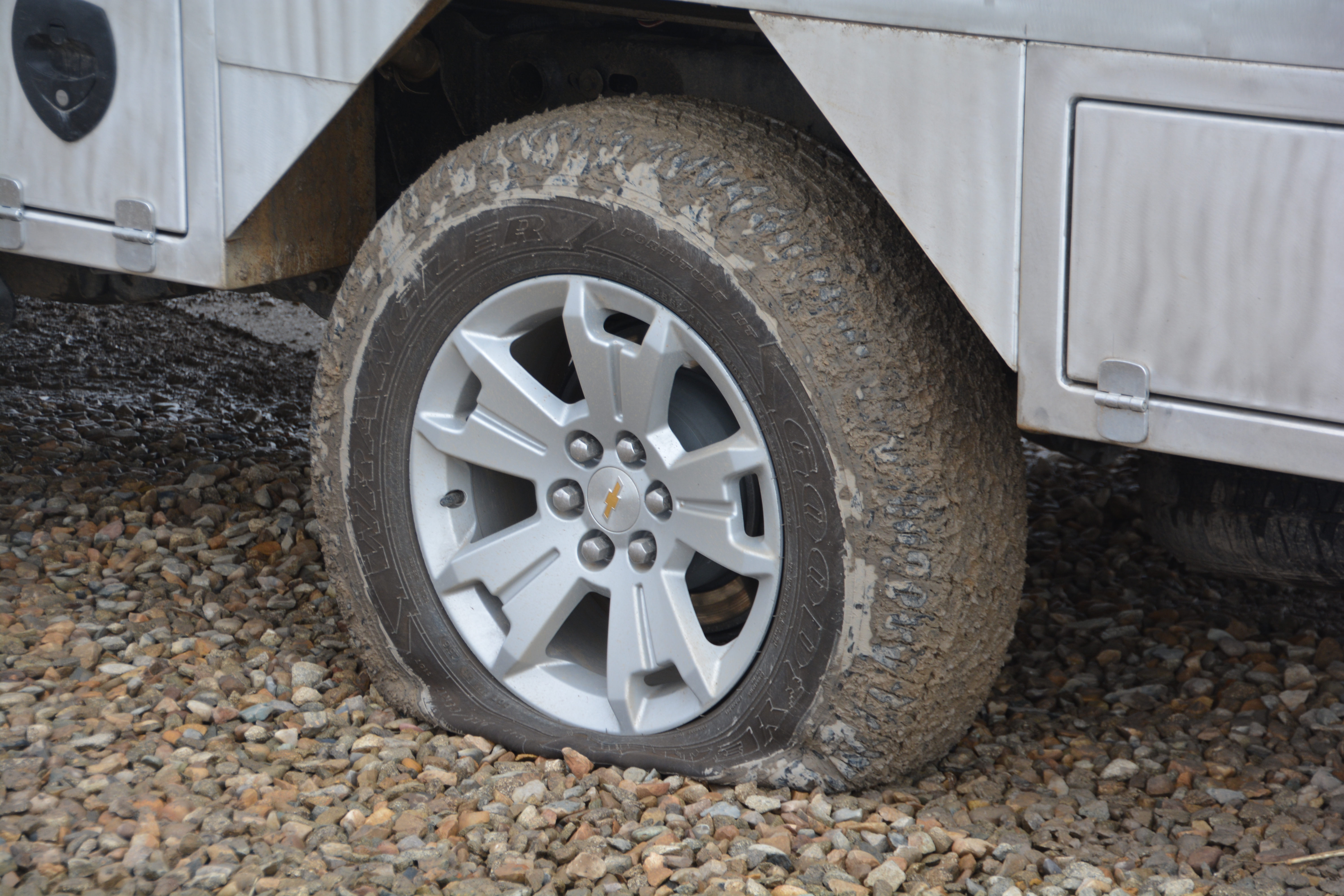 We had just passed through some fields with fresh snow from the night before and managed to pull into a local service station where I was able to park Tramp on some wet cold gravel and do what everyone hates to do – change a tire. We had some special challenges, besides the cold and the wind we soon learned that removing the spare tire from under the rear was much more difficult with the customised tray and bumper that Tramp now sports. I was also worried about whether the jack that was provided for the Colorado would be strong enough to lift both truck and camper.