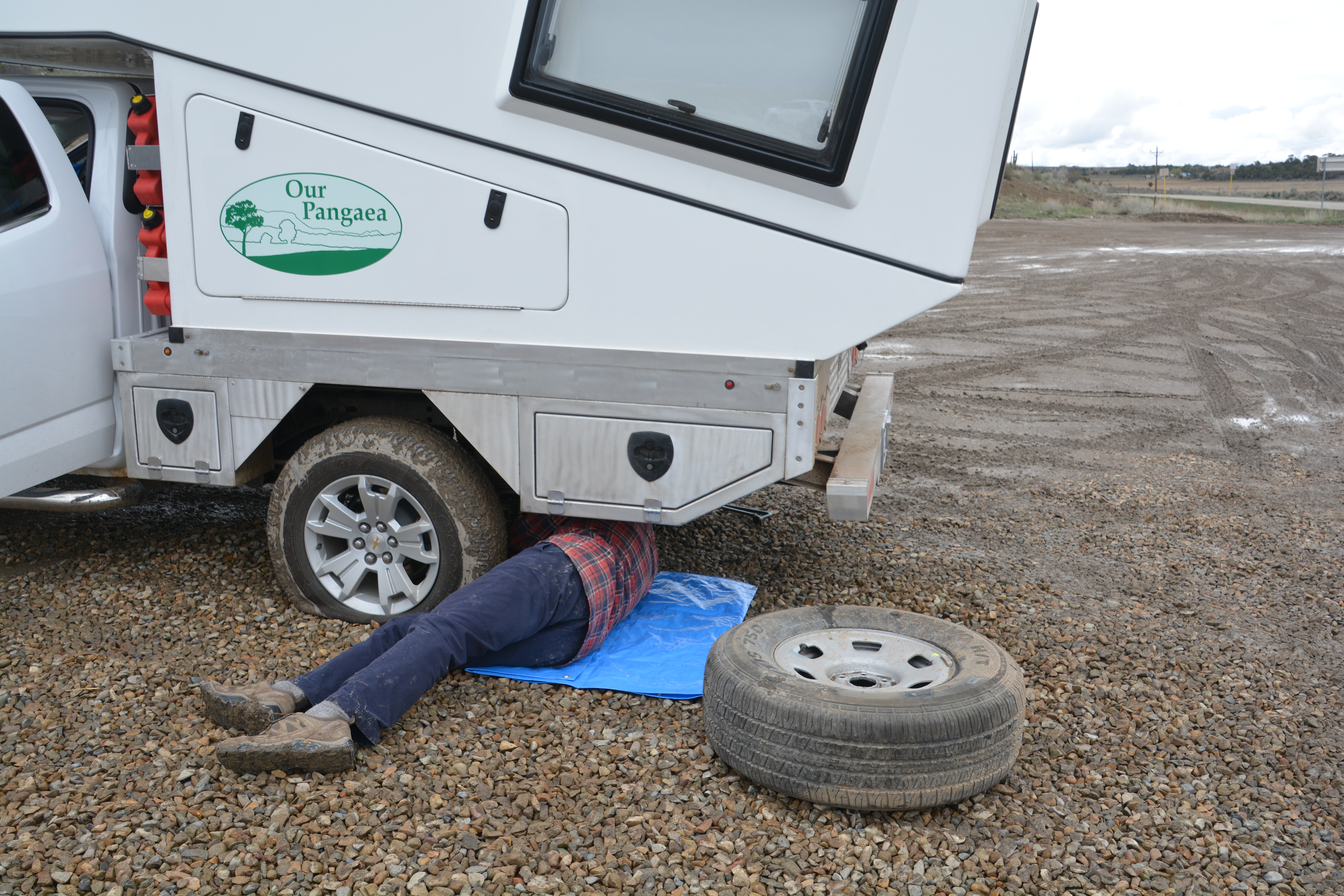 Over the course of the next two hours we learned to get the tire off under the custom bed, the jack was strong enough (phew) and that rolling around in the cold muddy gravel is not fun. But with the job done we limped into Cortez and also learned that the tire was unfixable and these exact tires are not available in town – they would need to be ordered.