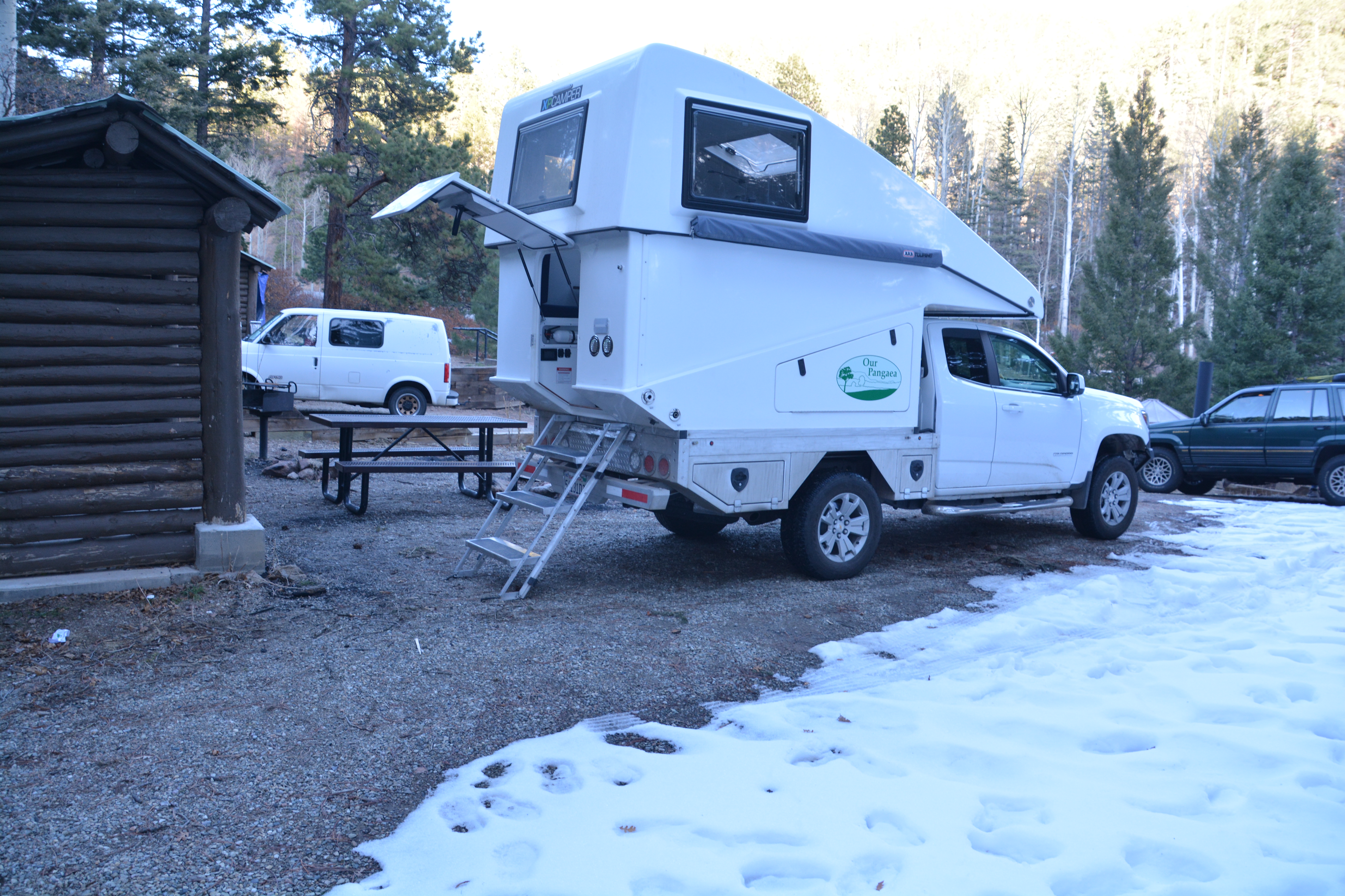 We headed back up in the nearby mountains, following the road through the Santa Fe National Forest to the Santa Fe ski fields where we got above the snow line again before finding a place to camp. As had been the problem in the past, with winter hanging on most campgrounds were still closed and those that were open had scarce space for late arrivals. After passing by spots with two feet of snow we sneaked in a spot at 8,500 feet (2,780 metres), parked Tramp at the edge of a snow patch, built a fire and enjoyed another night in temperatures around freezing.