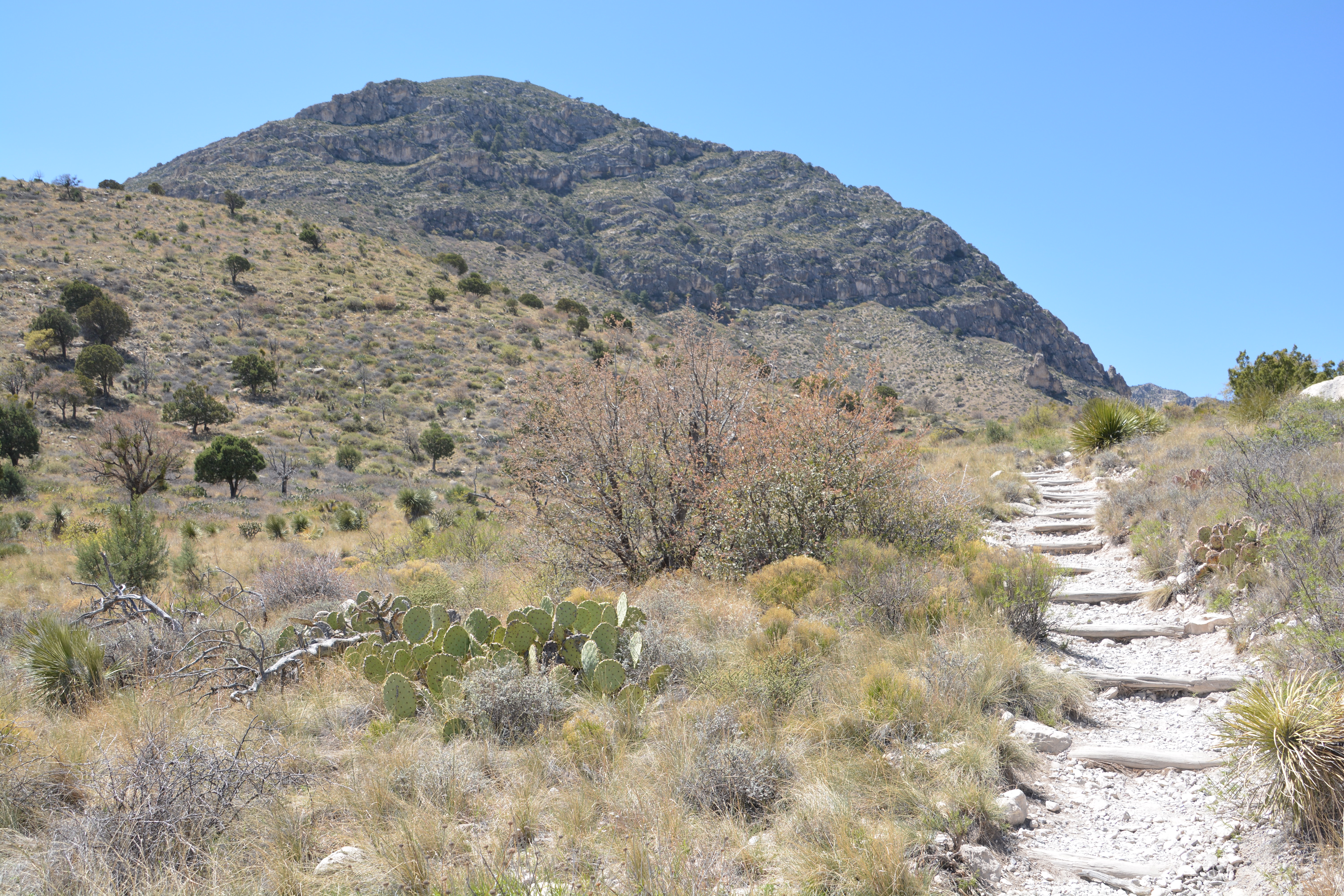 Occupying the southern reaches of the Guadalupe Mountains in the far western corner of Texas, the national park features a stunning range of high desert mountains with steep slopes and dramatic rocky escarpments, all covered with a range of dry brush and cacti that add a spring-time green tint to the landscape.