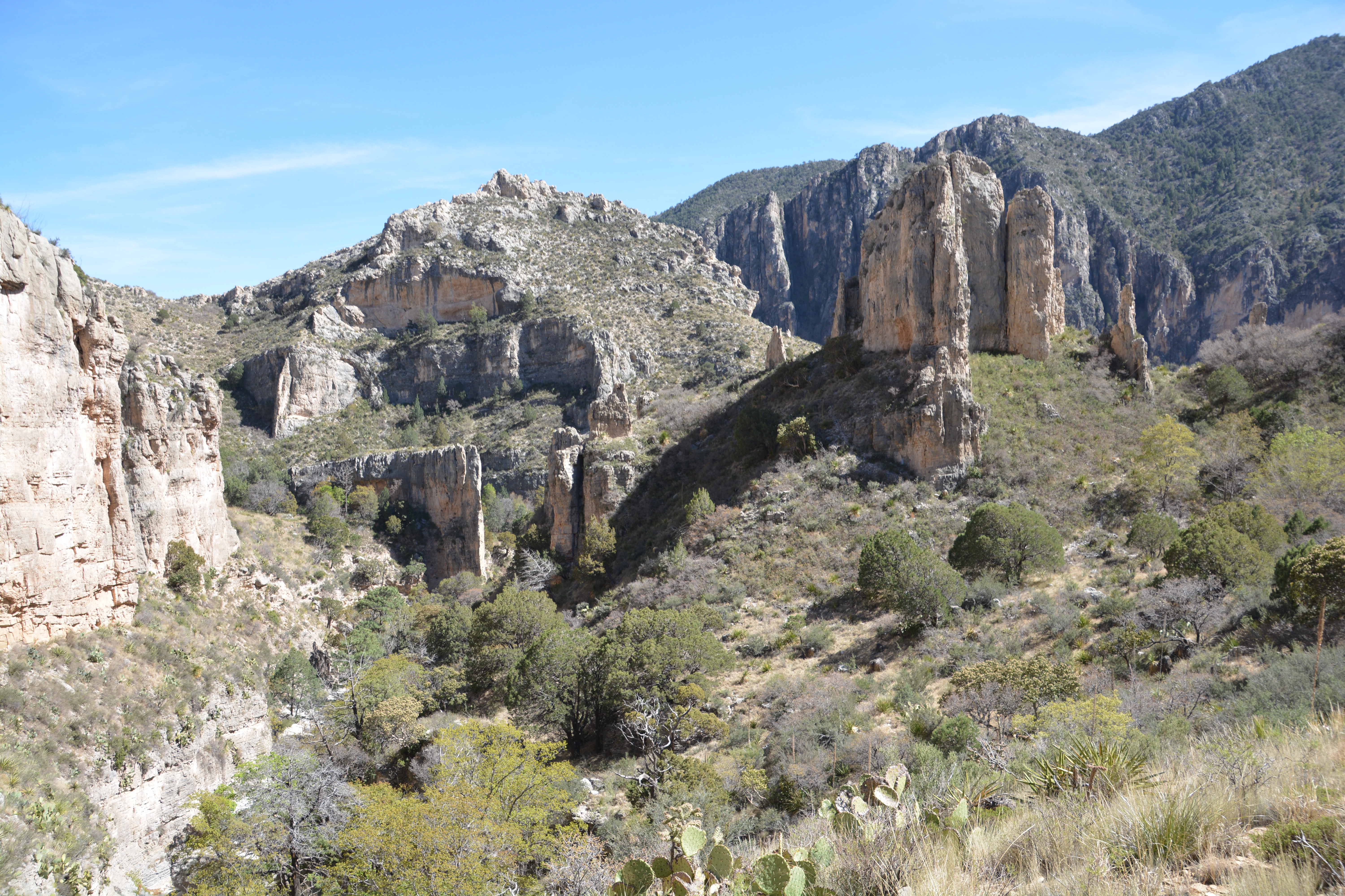 But not even the strong wind could detract from this beautiful walk, following a mountain creek that appears and disappears as the water seeps down into the limestone and then later burbles to the surface. Our goal was the Pratt Cabin, built by a wealthy oilman in the 1930’s as an escape from city life. The stone and slate cabin was in a beautiful site nestled amongst the pines, maples, walnuts and oaks that uniquely grow on the same slopes as numerous cacti. We saw a new cactus, the agave with its long stalk pointing skyward, and more of our favourites including the sotol, walking stick chollo, numerous types of yuccas and lechuguillas. Spotting cacti in their various forms is great fun.
