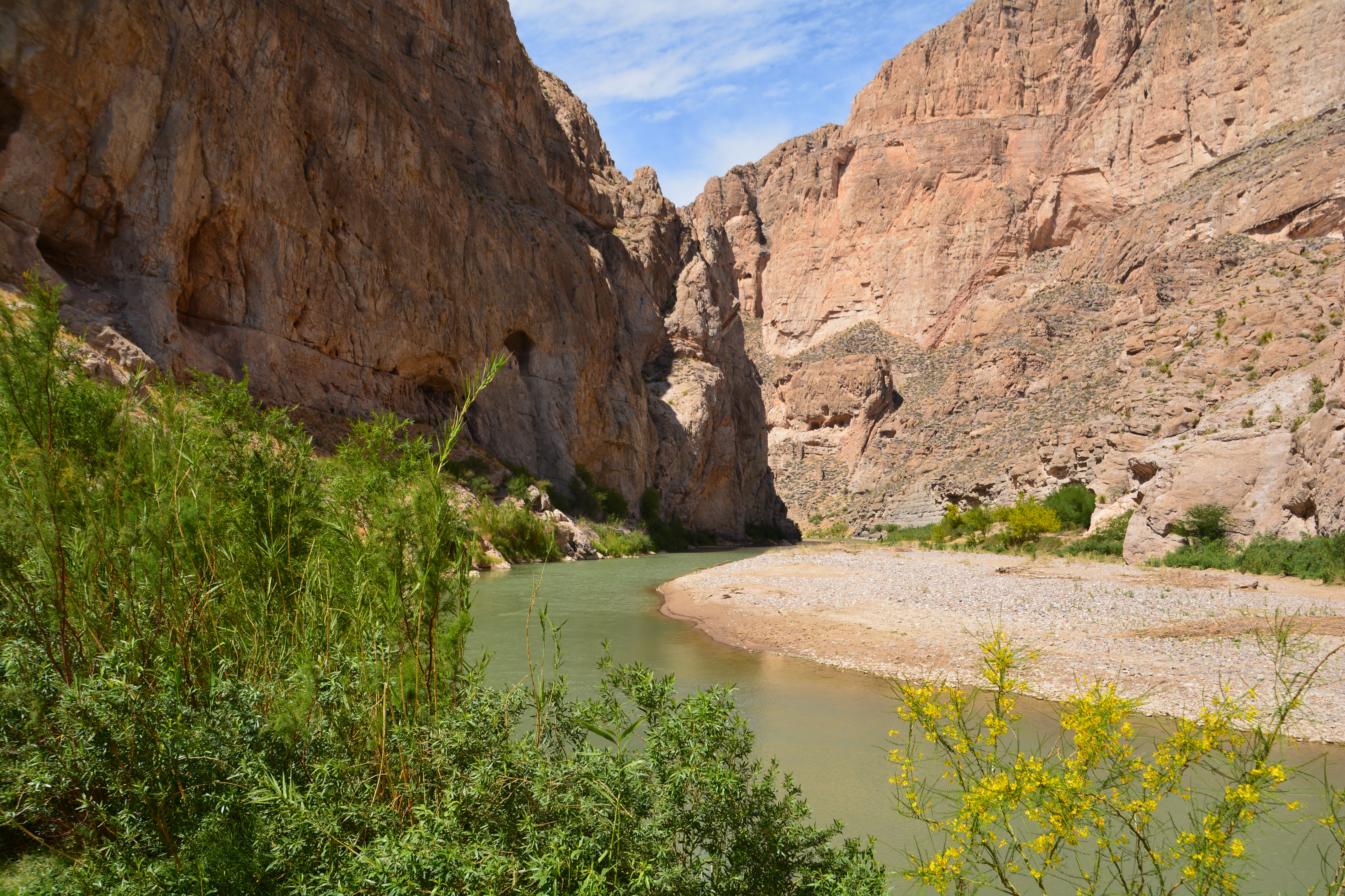 Along this stretch of the river the Mexican side features a vertical cliff that in places exceeds 1,500 feet (480 metres) in height. In this dramatic setting we followed the road past remains of adobe brick homesteads from hearty people who settled along the river’s banks over 100 years ago.