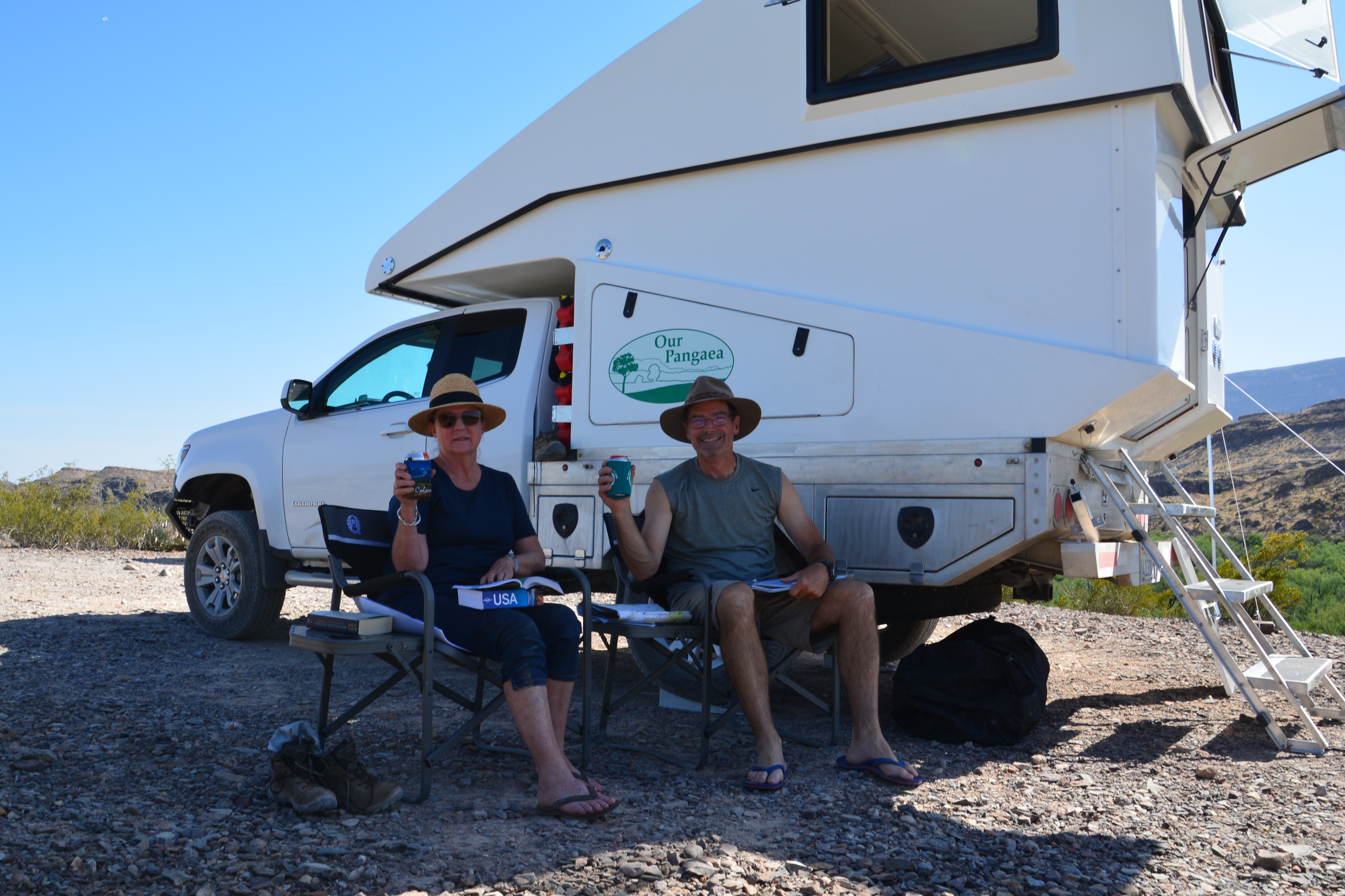 Temperatures in Study Butte were now reaching 101F (39C) and the afternoon was slipping by so we headed back along a dirt track to our campsite from the previous night, which we had fortuitously booked for two nights anyway, and pulled up in a familiar spot with the green trees of the river passing below us and Mexico’s high mountain cliffs above us. But it was hot, very very hot, Tramp was exhausted and we were melted. This is early spring and I’d hate to see this place in the middle of summer.