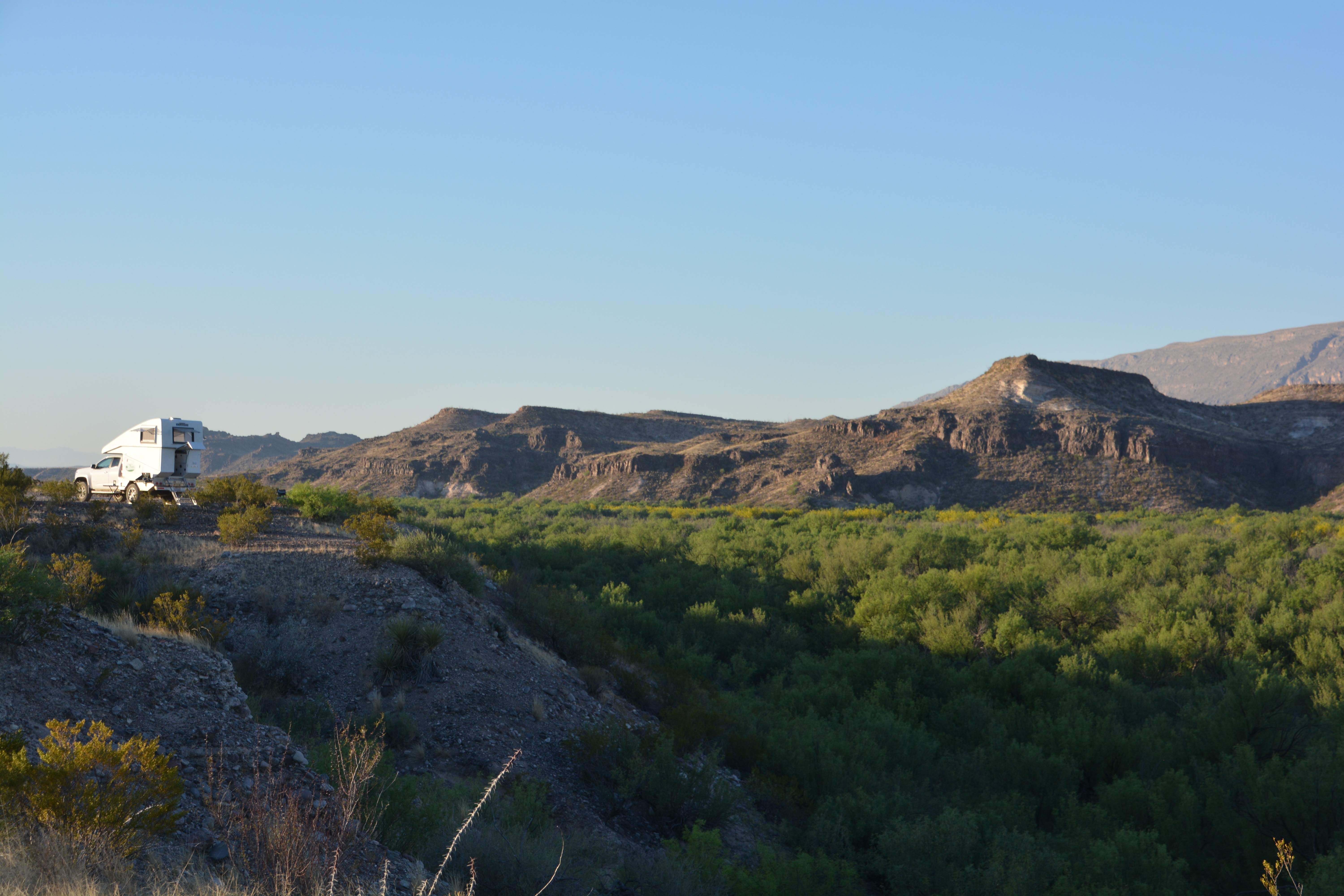 It was 85F (30C) and stinking hot without the hope of a breeze as we pulled up to our camping spot above the river. We knew we had broken away from the rest of the world and would be able to enjoy some delightful isolation. Below us was a wide green strip of land, thick with healthy trees that lined the Rio Grande. We could not see the river itself, so lost it was in the branches of these trees, but we knew it was only a seven iron away.