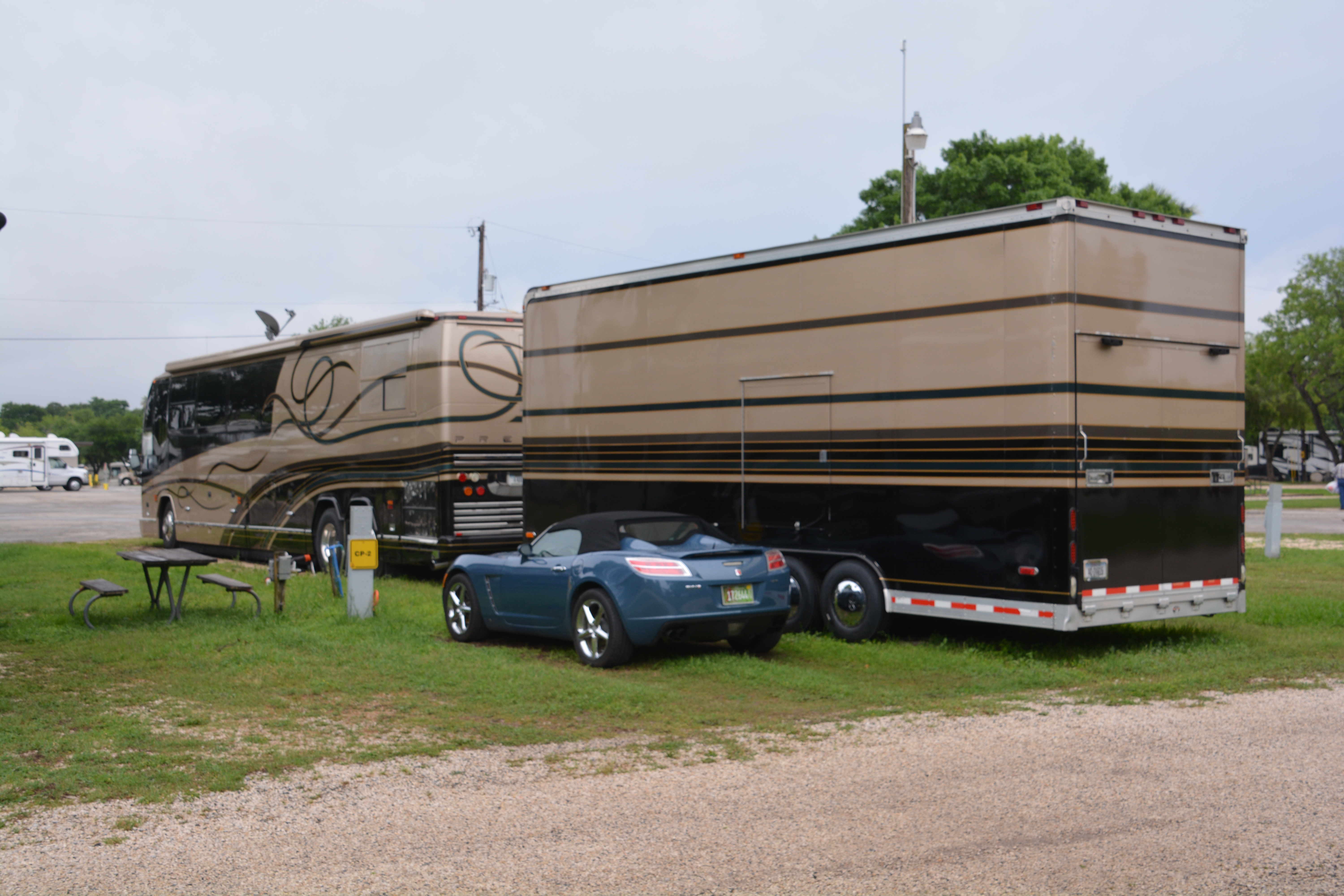 Texans love their RVs and the bigger the better. This bus-sized RV also pulls a huge toy trailer which carries this nice little sports car and probably many other essential items for these two people