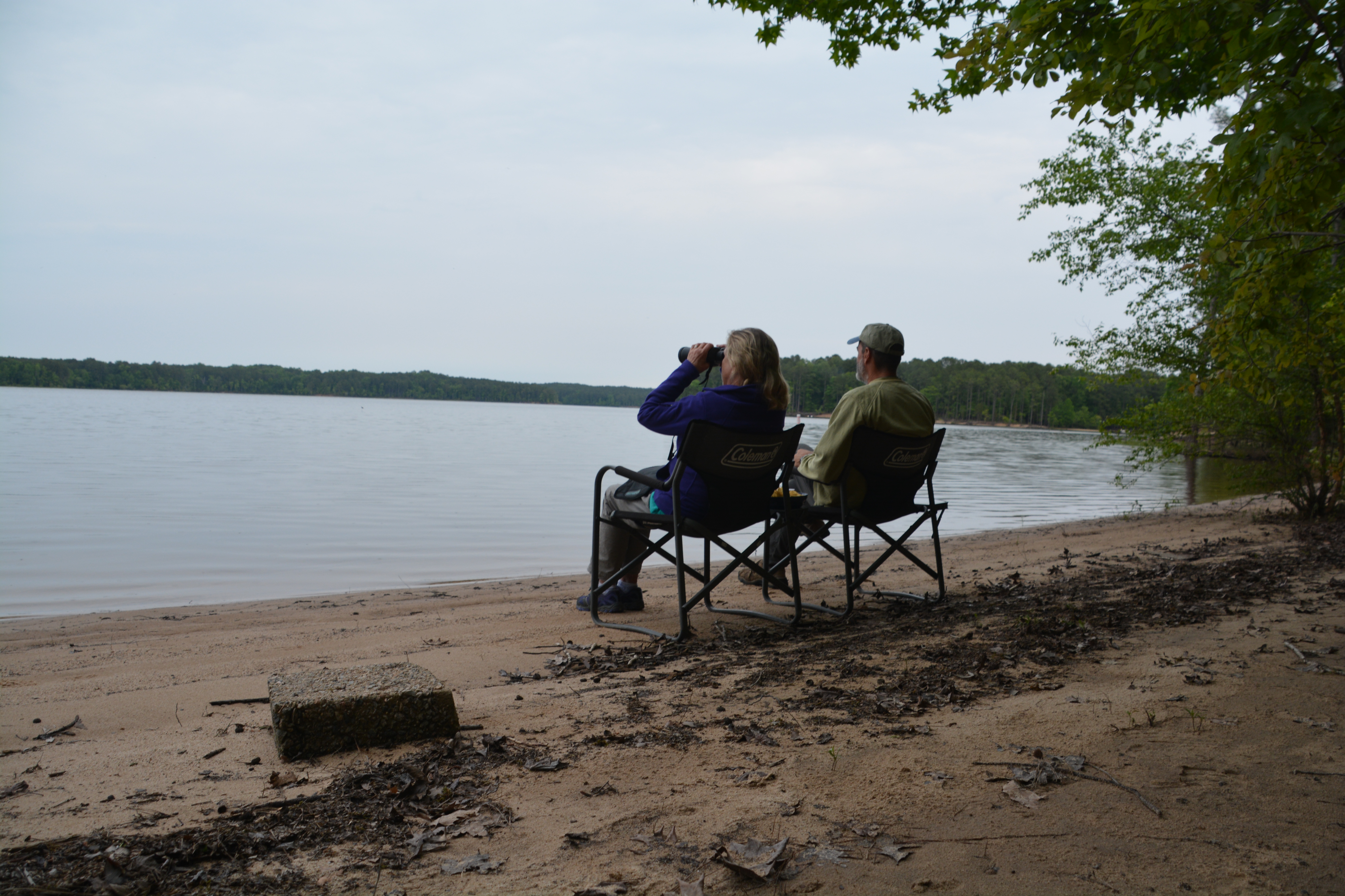 Enjoying our traditional cocktail hour on our private little beach on Jordan Lake in central North Carolina