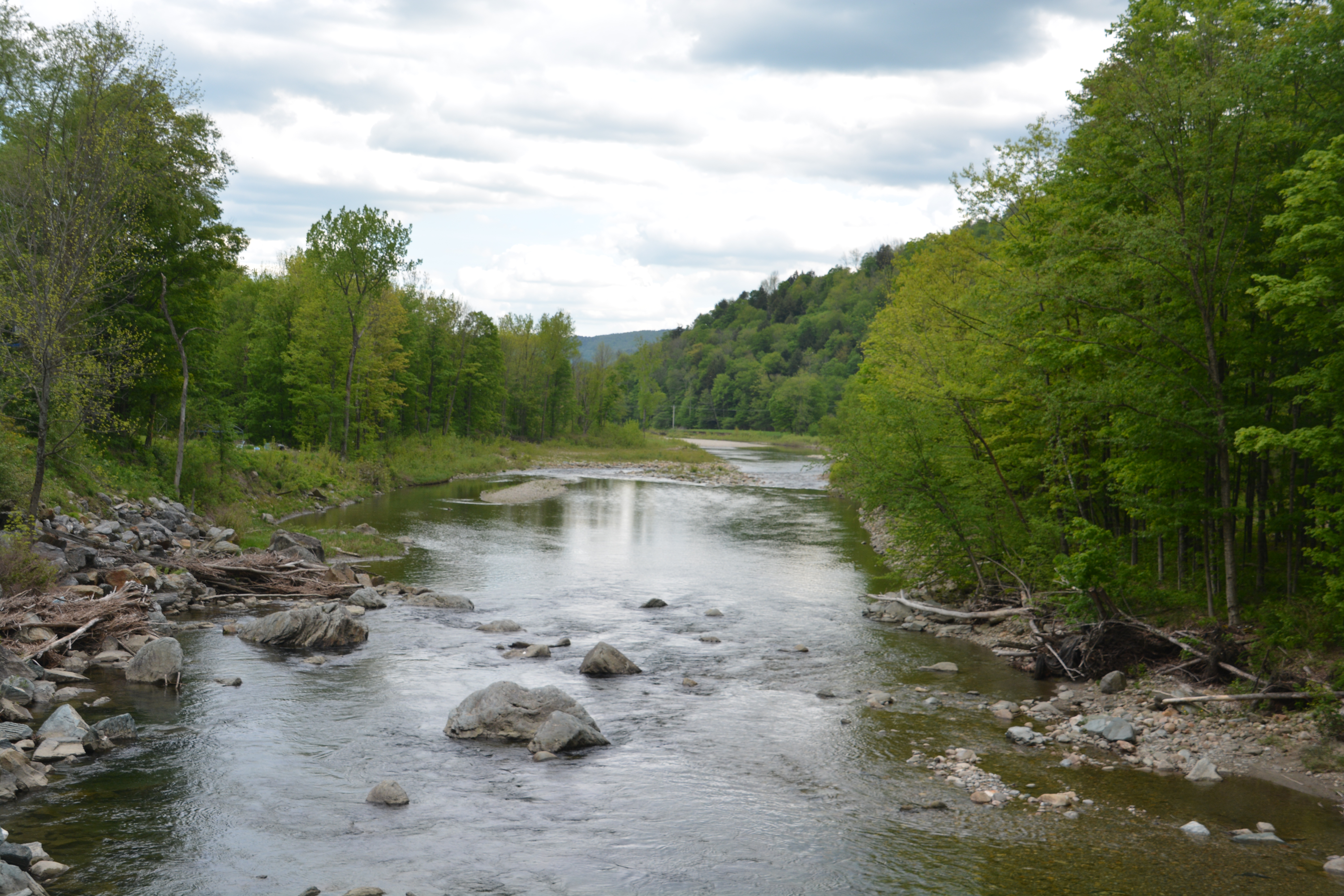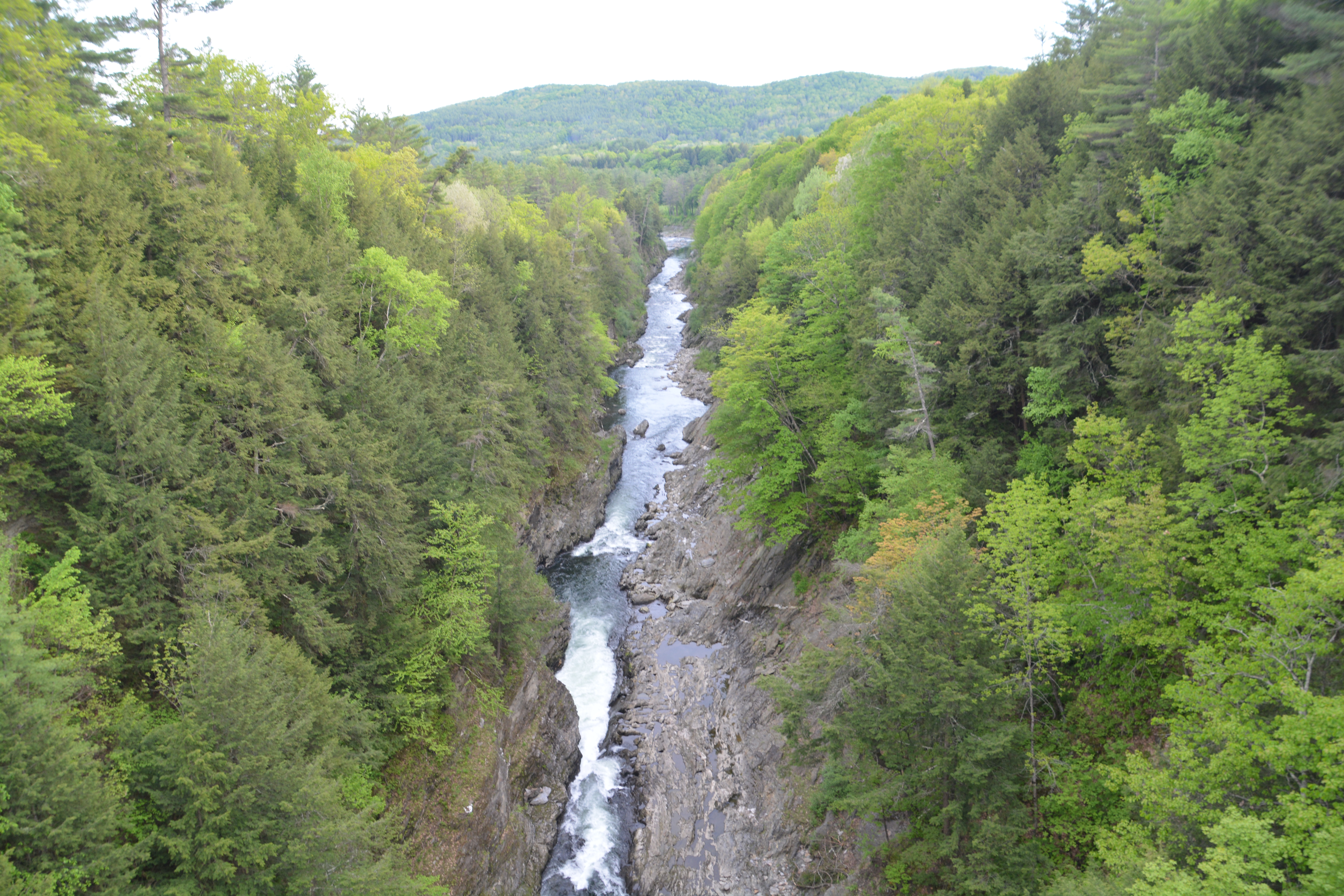We followed rolling green hills through tiny little quaint towns to the ski mecca of Stowe in northern Vermont. From here we followed green Hwy 100 south along the White River (sorry, not green), mile after beautiful mile, through narrow gullies, open green plains, weaving past high mountains covered in an endless supply of broadleaf trees until finally we made it to the little town of Quechee. We walked along the edges of the deep and narrow Quechee Gorge, formed by glaciers 13,000 years ago and now featuring a raging Ottauquechee River (not a typo), and camped under the fresh green trees nearby. We felt very comfortable and at home in Vermont.