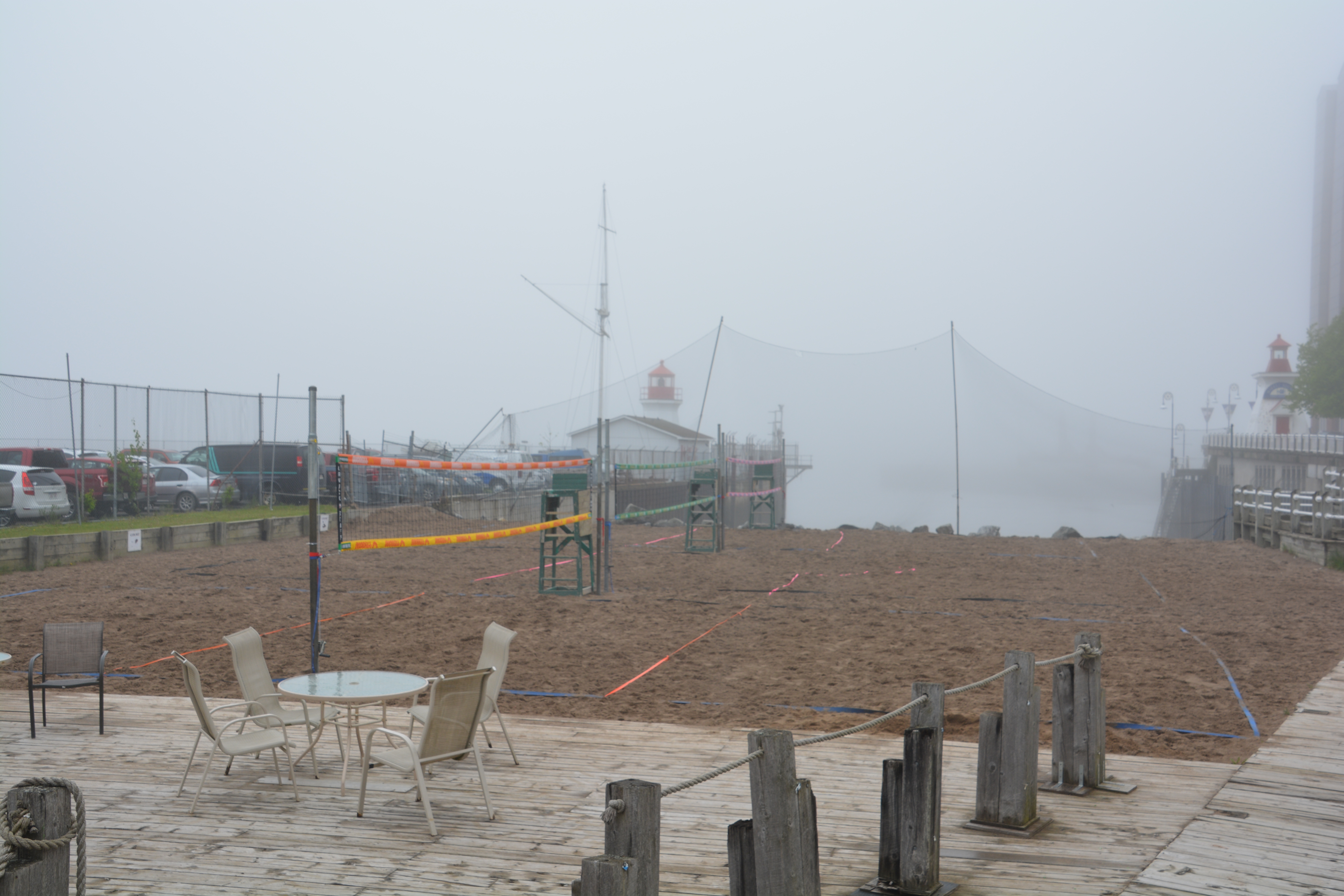 Beach volleyball anyone? These outdoor courts in downtown St. John look way out of place in the heavy fog and cold wind