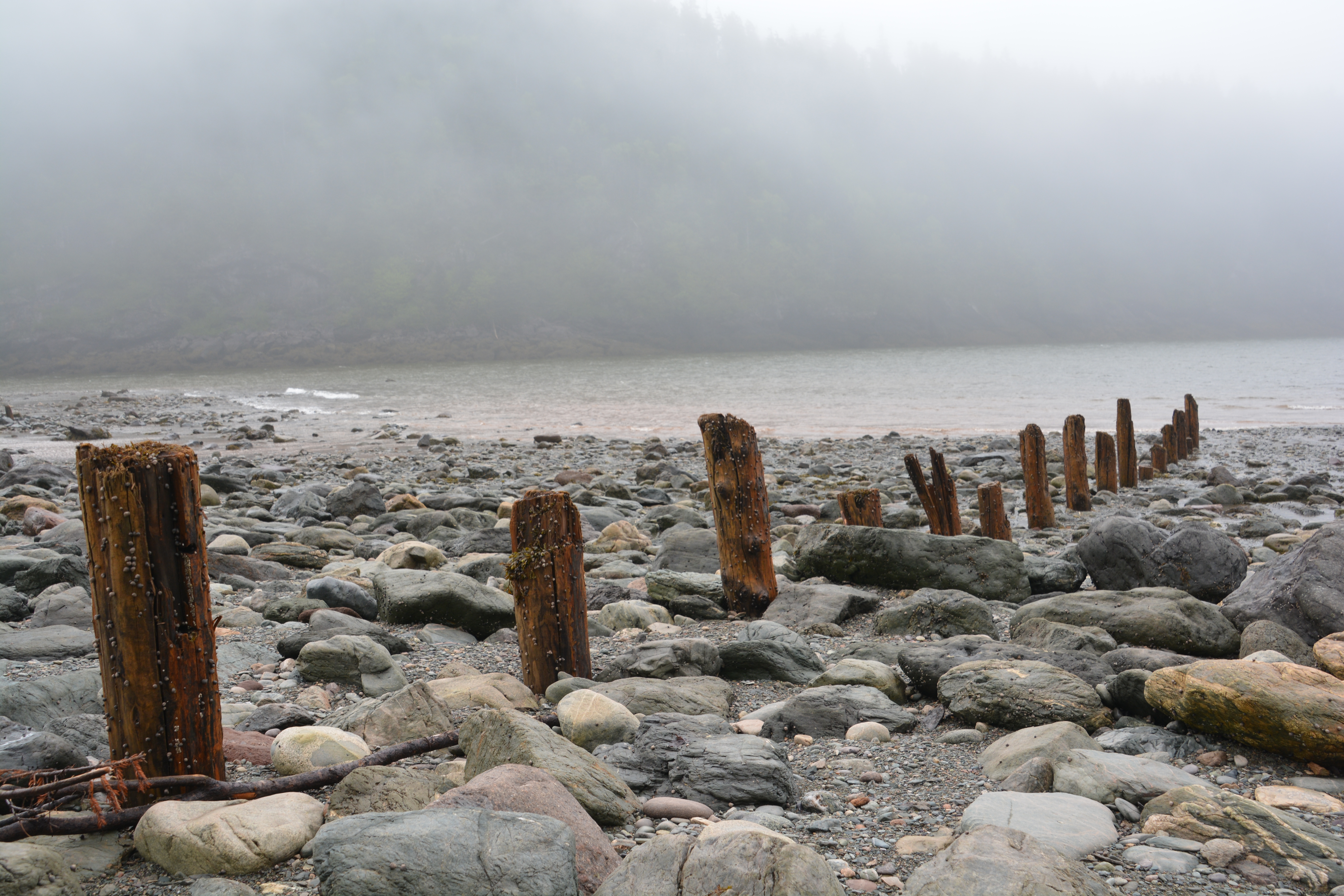 We then followed the coastline north to Cape Enrage, which wins the Best Name of the Year Award in our books, a lonely and cold lighthouse sitting out on a small point overlooking some the deepest tides in the world. The fog was so thick we needed the lighthouse’s foghorn, which sounds out every six seconds, to give us our bearings. We were there right at low tide and managed the steep steel steps down the cliff face to the rocky shore. We walked amongst the rocks and seaweed, basically walking on the ocean’s floor, looking up at the vertical cliffs that separate sea from land. A truly eerie and bizarre experience.