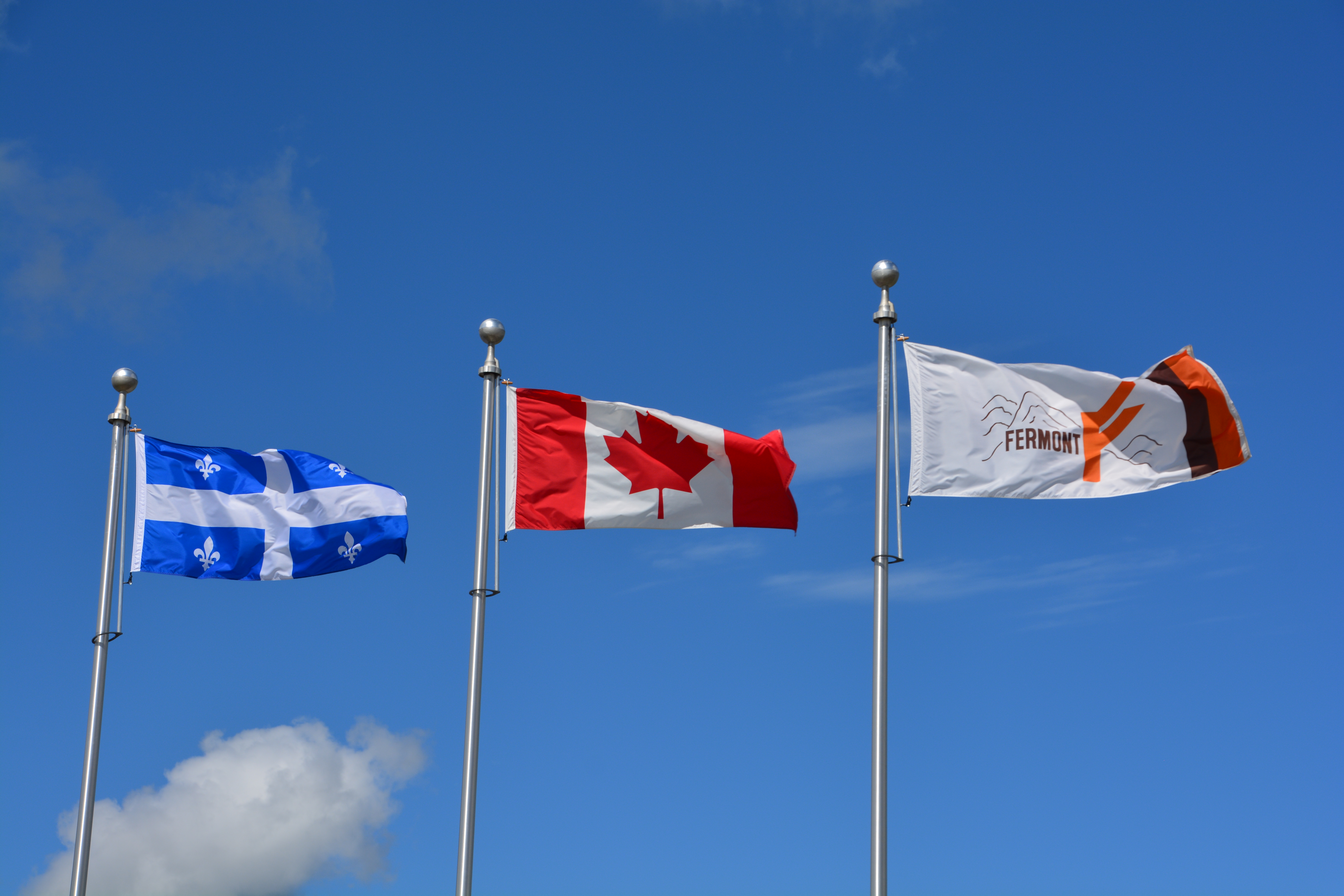 Our first sight in Quebec – their pretty blue and white flag and the local mining town’s flag flanking the maple leaf