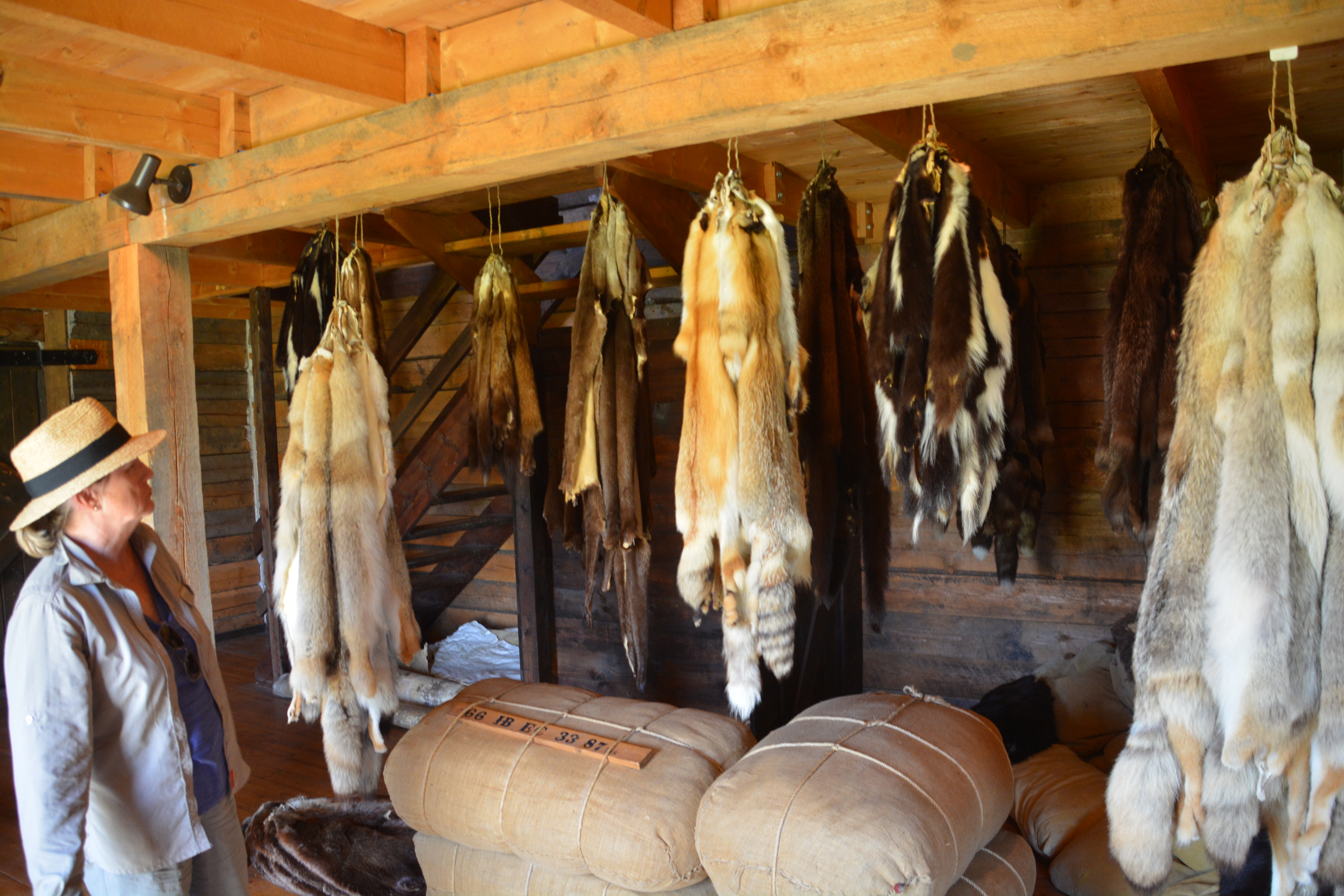 Julie checking out a collection of real fur pelts at the fort, including ermine, mink, fox, coyote, wolf, muskrat and of course beaver